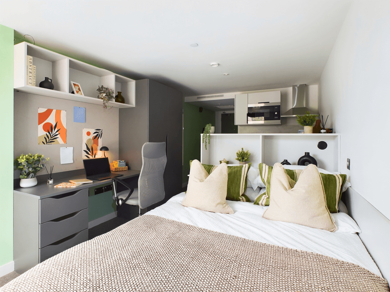 Our Silver Studio sized between 16sqm-20sqm and located on floors 4 - 6, offers in-room air conditioning, a comfortable bed, a study desk and chair, a cupboard and ample storage for your convenience. The fully equipped contemporary kitchen allows you to prepare meals with ease, while the private bathroom offers privacy. A table with two high chairs adds a touch of modernity to your living space. The studio boasts contemporary and elegant furnishings throughout, truly elevating your student living experience. You can also enjoy the communal areas in the building like the pilates studio, private dining and more. Book your studio today!