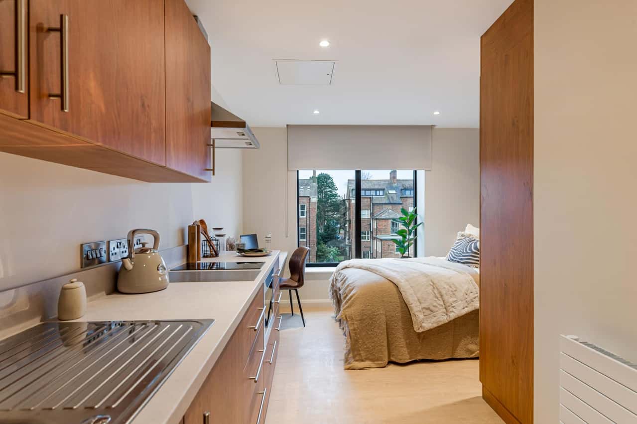 Step up to more space and elevated comfort with our Classic Plus Studio, ranging from 17m2 to 19m2. This popular choice offers all the premium features you expect: a comfortable bed, a dedicated study area, plenty of storage, a fully equipped private kitchen, and your own private bathroom. The increased floor space allows for a more relaxed and spacious student living experience, all within the confines of our sleekly furnished development. You'll also benefit from the range of helpful amenities in the building such as our communal lounge and courtyard. Secure your Classic Plus Studio today to enjoy a refined student lifestyle at Ryan Hall.