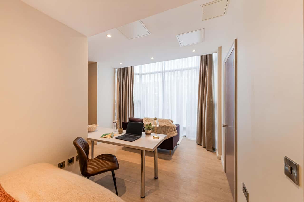 Experience a student living experience like no other in the Deluxe Bay Studio at Ryan Hall. A magnificent space ranging between 27 and 29 square metres in size. The defining feature of your room is the large bay window, which not only bathes the room in glorious natural light but also creates a distinctive look to your residence. Beyond this, you'll find a comfortable bed, functional study station, great storage, a fully equipped kitchen, and a private bathroom for your convenience. Secure your place today to witness the height of university life in Belfast.