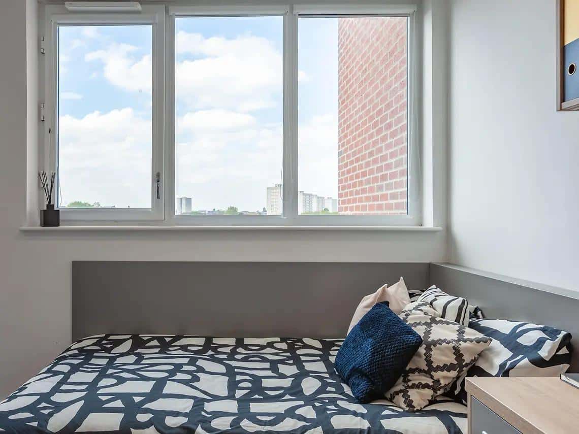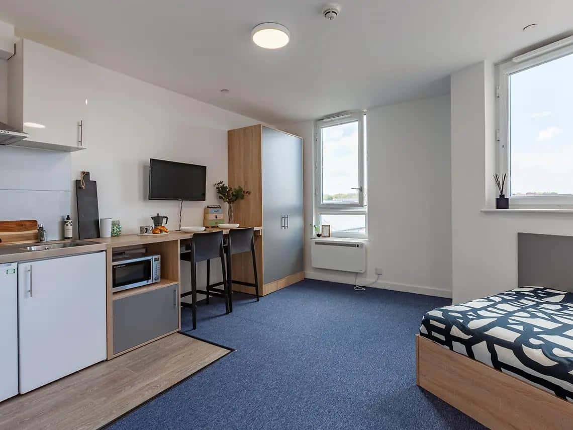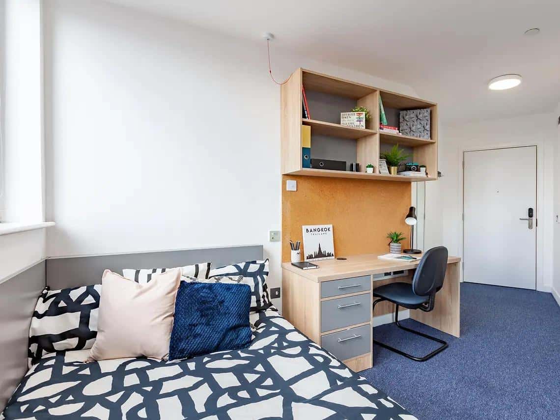 The Deluxe Studio provides exceptional self-contained living at Globe Works in Birmingham's vibrant Jewellery Quarter. This generously proportioned studio features a luxurious bed, a study desk with ample workspace, a private bathroom, and a comprehensive kitchenette for seamless meal preparation. The additional space transforms daily life, allowing you to create distinct areas for studying, entertaining, and relaxation. All Utility Bills are included to simplify your finances, whilst our atmospheric Cinema Lounge and secure Bike Storage aid your experience. For Birmingham students seeking spacious, independent living without sacrificing community, the Deluxe Studio delivers on every level.