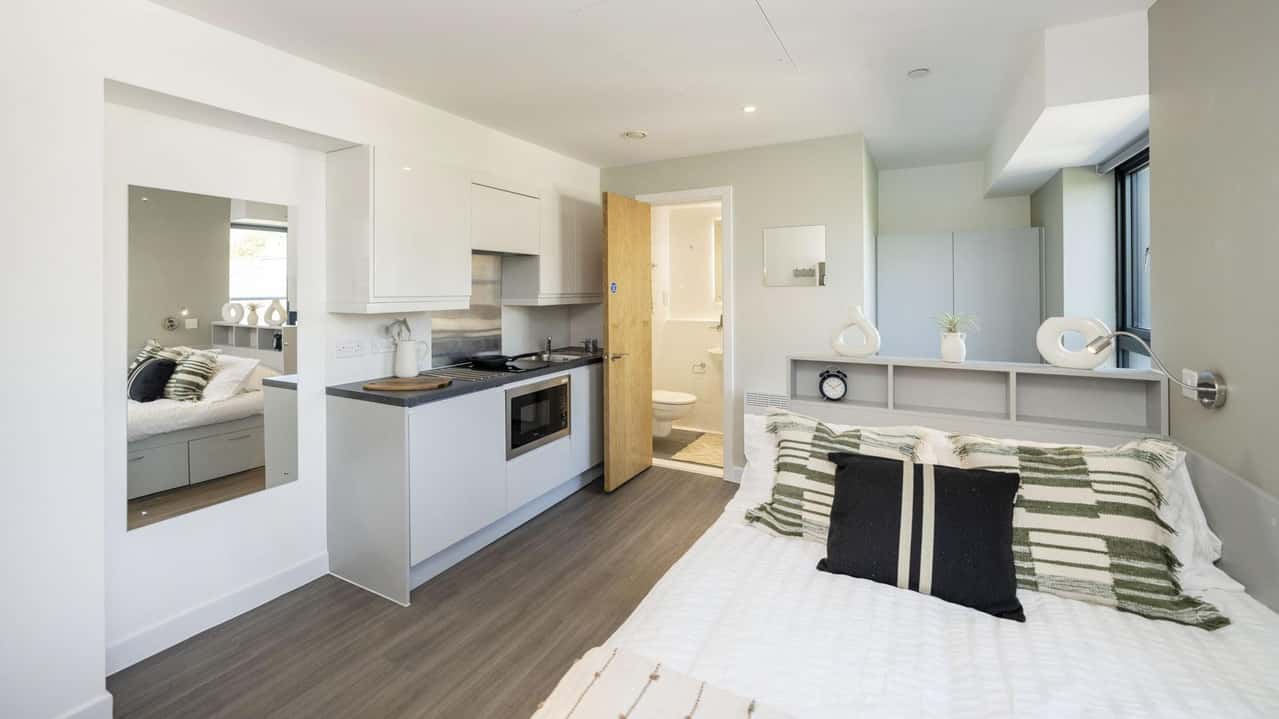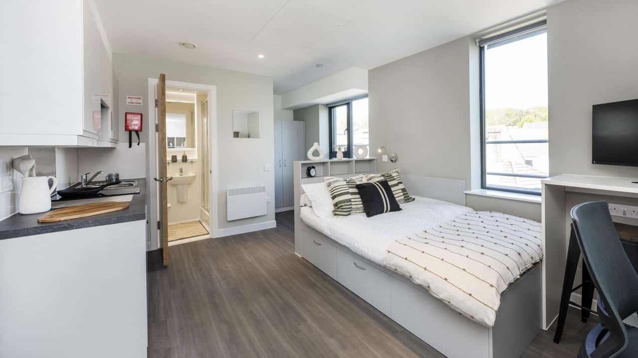 Relax in our Large Studios, with room sizes ranging from 18.9m2 to 19.2m2. Enjoy a restful night's sleep in your 3/4 size double bed with under-bed storage, and cook up meals in your kitchenette with a 2-ring hob and extractor. Dine at the breakfast bar, then freshen up in your en-suite bathroom with shower and WC. Stay organised with ample storage options, including a wardrobe and study desk with drawer space and a chair. Don't miss out, book your studio today!