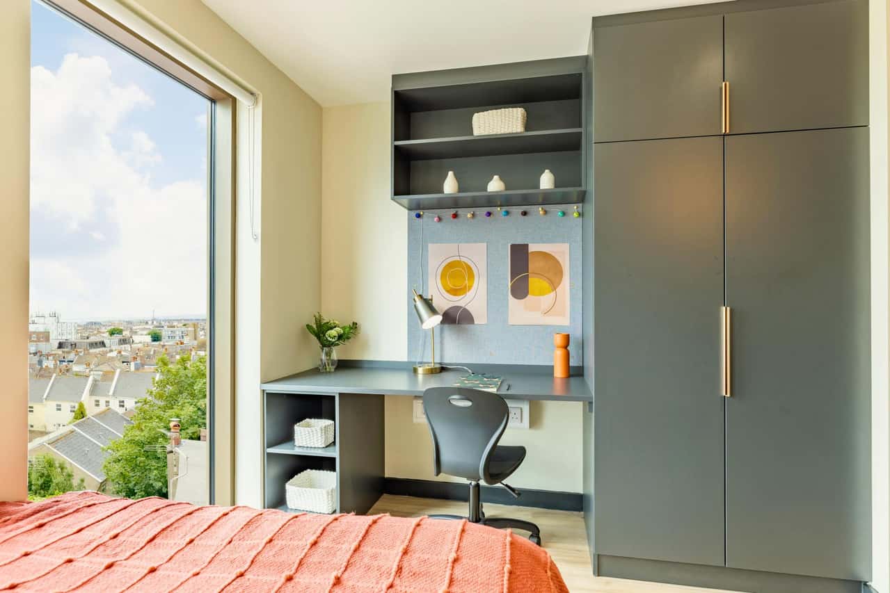 Experience comfort and convenience in our Premium Studio, located lower ground and ground floors, measuring 20 - 20.6 square metres. With a cosy 3/4 size double bed and under-bed storage, you'll have a restful night's sleep. The room features a breakfast bar and an en-suite bathroom with a shower. Stay organised with a study desk, double wardrobe, and built-in microwave combi oven. Make use of the full-length mirror and pinboard. Integrated fridge with freezer compartment ensures your snacks stay fresh. Perfect for students seeking a balance of comfort and functionality. Book your room today!