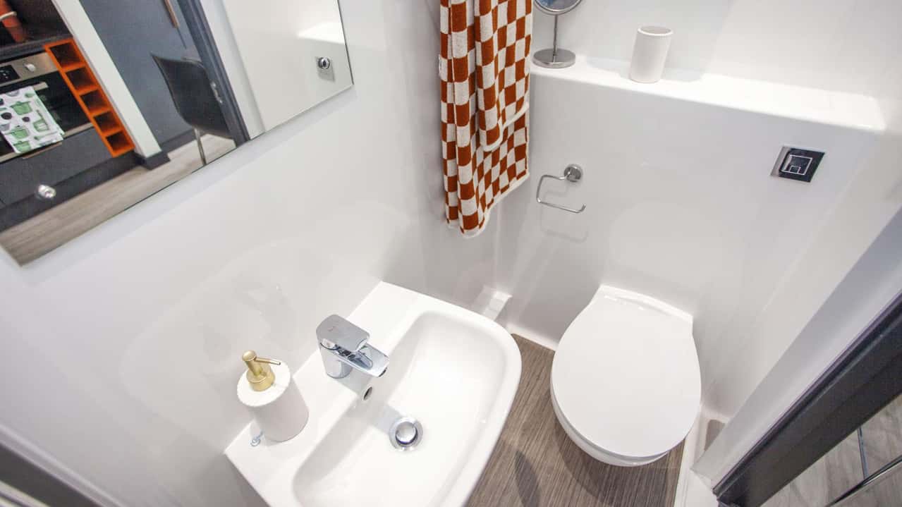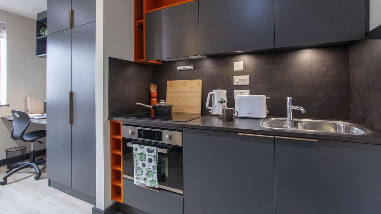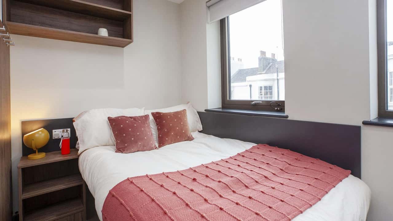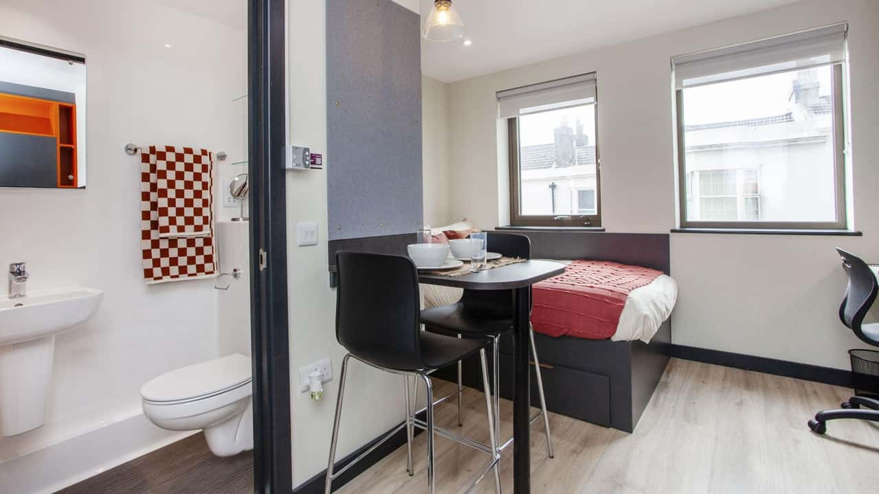 Our Club Studio, located on lower ground and ground floors, sized 14.1 sqm to 15.8 sqm. Featuring a 3/4 size double bed, plenty of storage, and study desk with chair. The room includes an en-suite bathroom with a shower and WC, along with a full-length mirror and pinboard. Cook meals using the 4-ring hob with extractor and built-in microwave combi oven. With an integrated fridge and freezer compartment, this studio offers all the comforts of home. Some Club Studios also feature a breakfast bar, depending on the layout, giving you extra space to eat, study, or just enjoy your morning coffee.