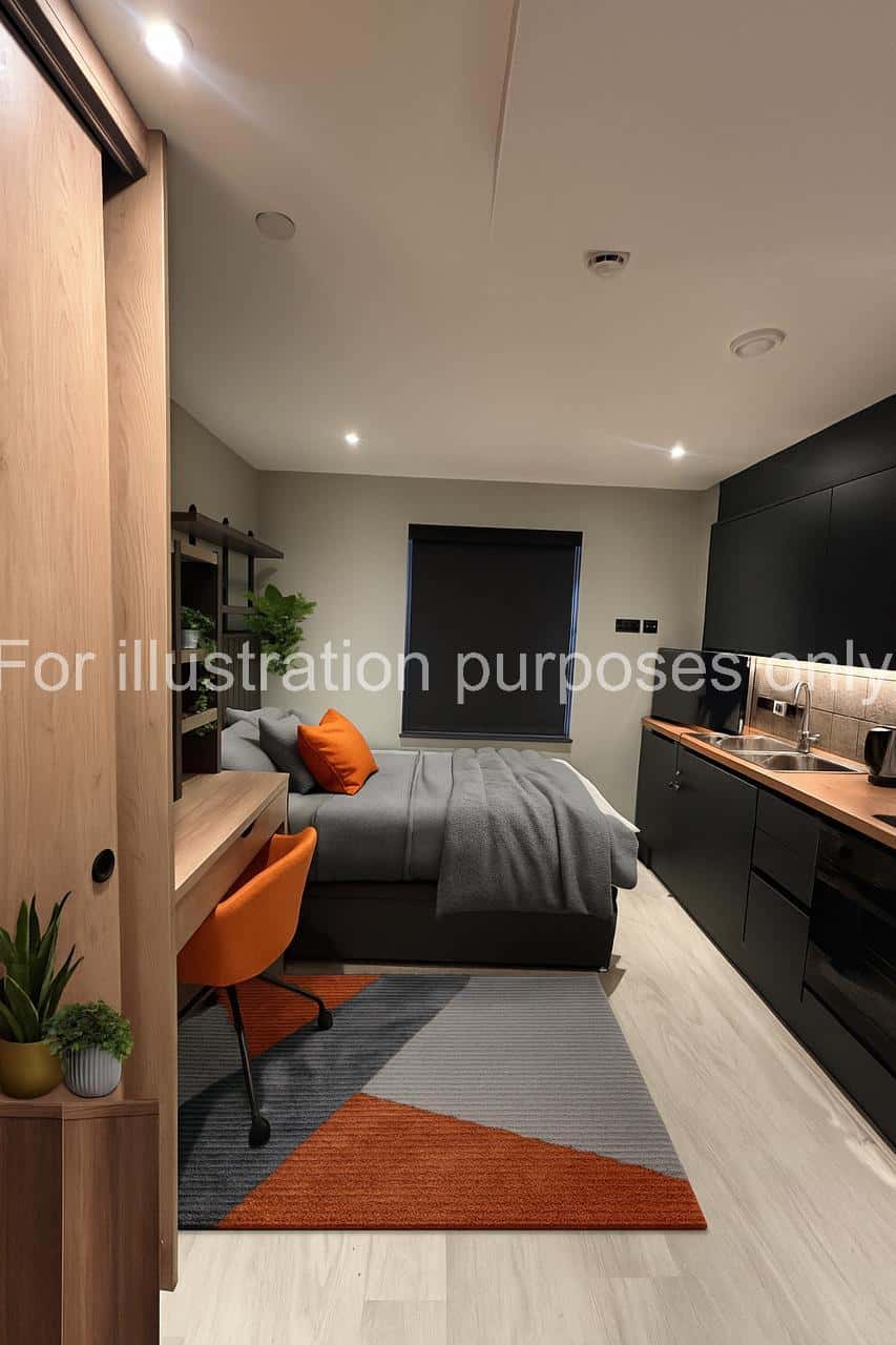 Looking for a unique student space? Our Saver Studios are budget-friendly studios located on the lower ground floor, in our townhouse block A. These cozy studios range between 15.5–17.8 sqm offering a private and peaceful living. With a small double bed, a private bathroom and your own kitchen, this is the perfect spot for students who want something different.