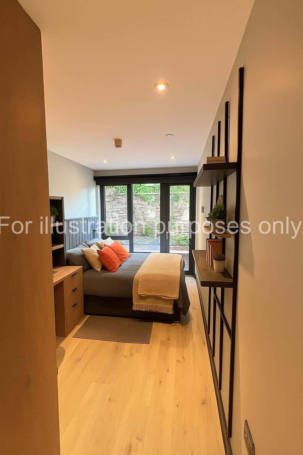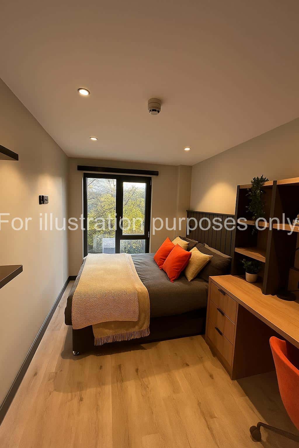 The bed is small double and is positioned beside the window with a bedside table, giving you the perfect spot to unwind and enjoy the view. Each room includes your own private ensuite bathroom, study area, and ample storage.