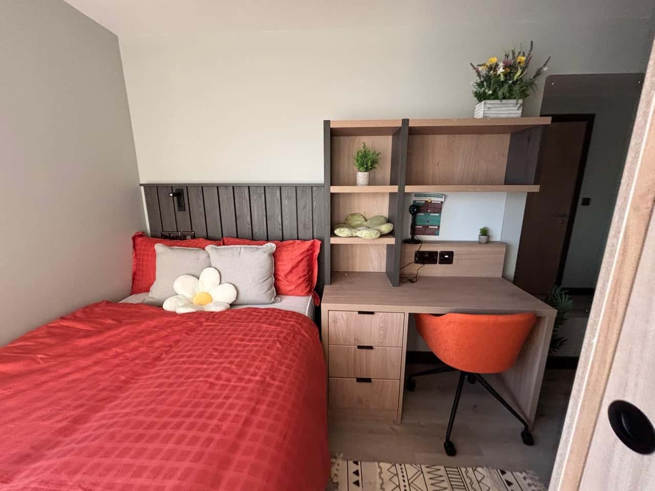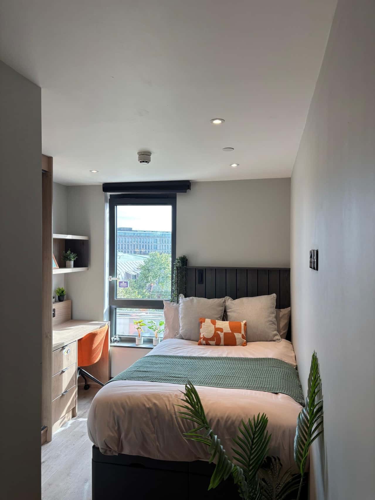 The bed is small double and positioned neatly against the wall, creating an open area in the centre of the room perfect for studying, relaxing, or personalising your space. This layout helps make the room feel cosy, efficient, and easy to keep tidy, while still leaving plenty of room to move around.