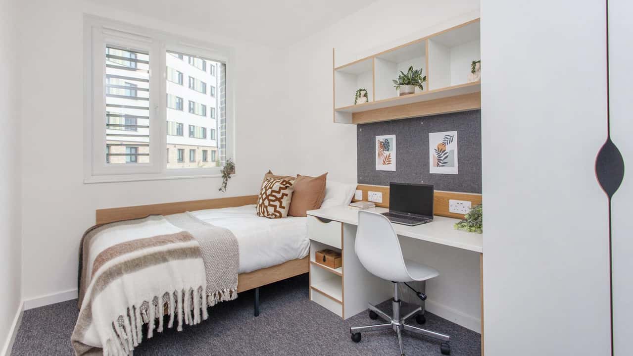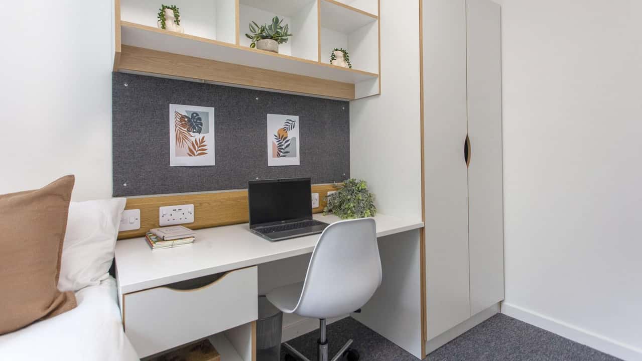 Premium Single rooms in Leymus House give you the best of both worlds: your own private ensuite bathroom paired with a bright, comfortable living space. Each room comes fully furnished with a four-foot-wide bed (perfect for a double bedding pack), desk, chair, wardrobe, shelving, mirror, lamp, and bin. You’ll share a spacious kitchen with 9 to 12 other students, complete with two hobs, two ovens, multiple fridges and freezers, a microwave, and more. With 11.8m² of space, these rooms are ideal for undergraduates who want a mix of independence and a sociable campus lifestyle.