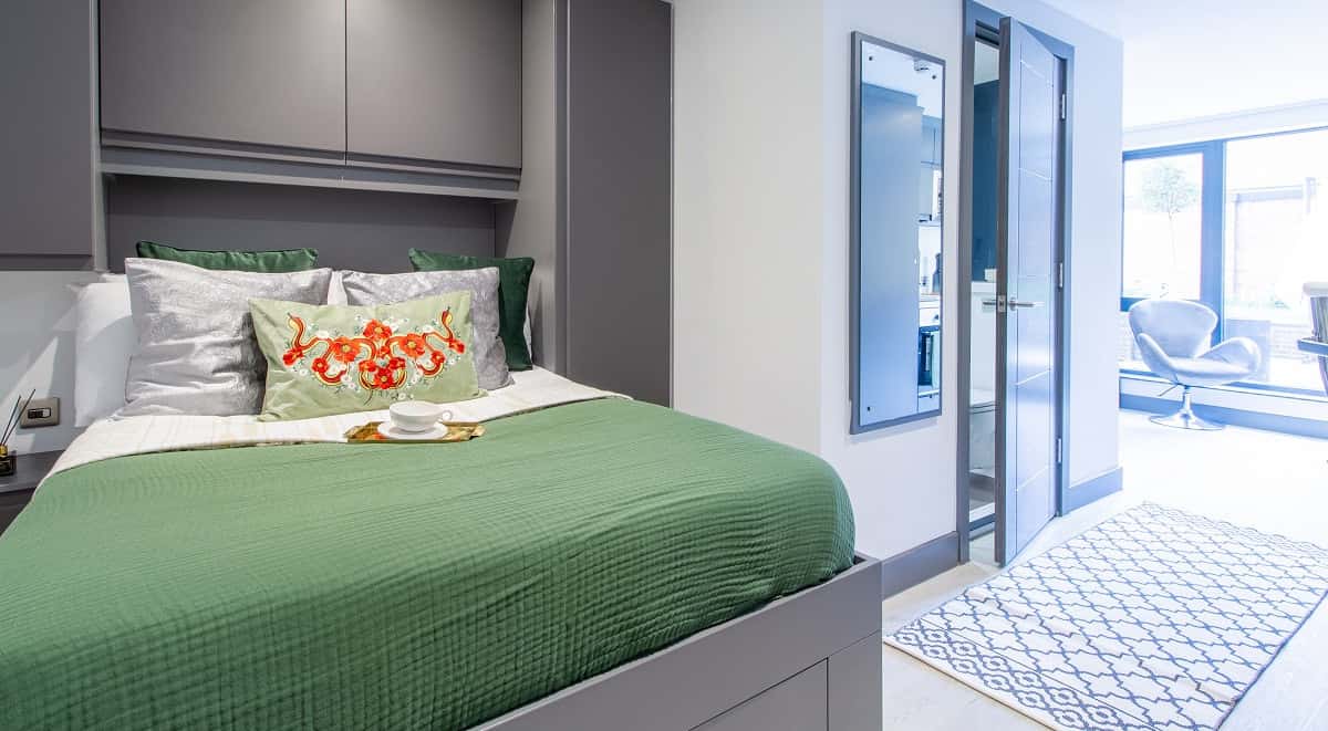 The Parkside studio comes a fully fitted kitchenette, stylish en-suite bathroom, ample storage and panoramic views from the 9th floor. Each studio boasts a three quarter bed, large study desk and chair, a modern kitchenette and large windows to enjoy the view.