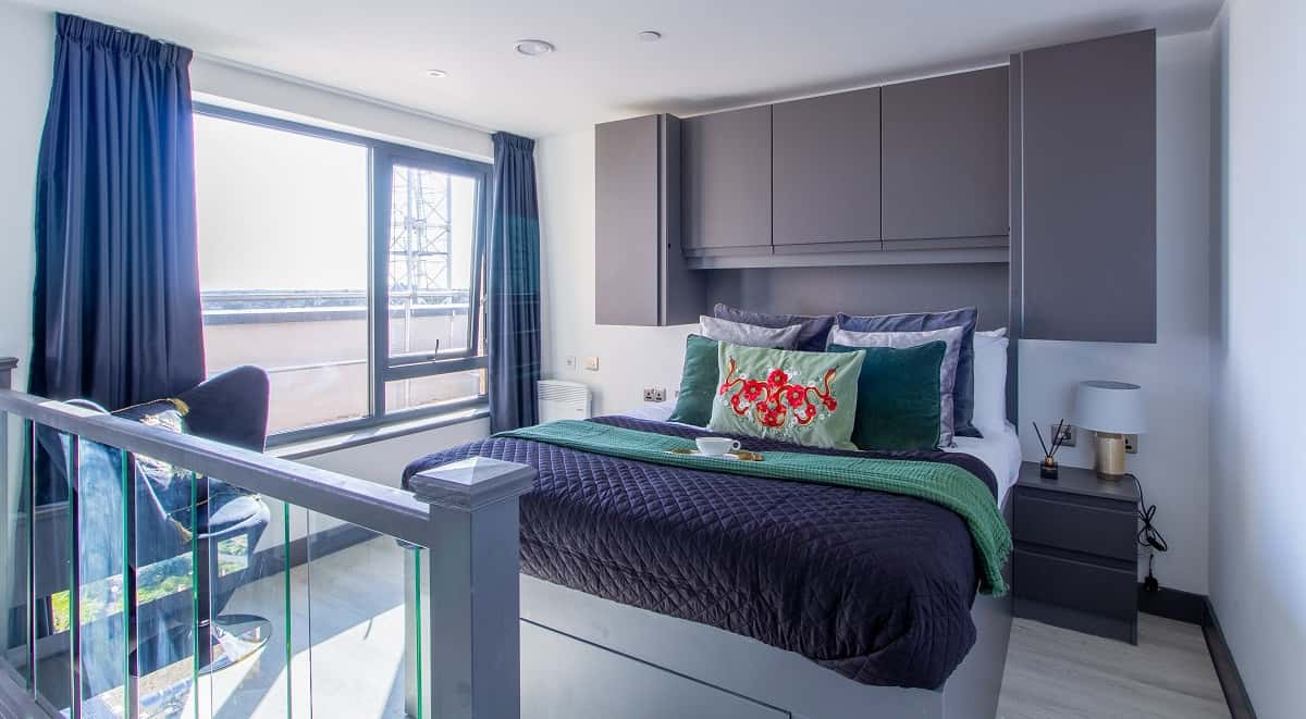 The Premium Mezzanine studio is split over two floors and comes complete a fully fitted kitchenette, stylish en-suite bathroom, a luxurious balcony, ample storage and panoramic views from the 10th floor. Each studio boasts a three quarter bed, large study desk and chair, a modern kitchenette and large windows to enjoy the view.