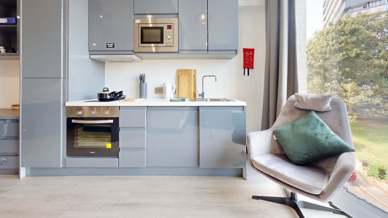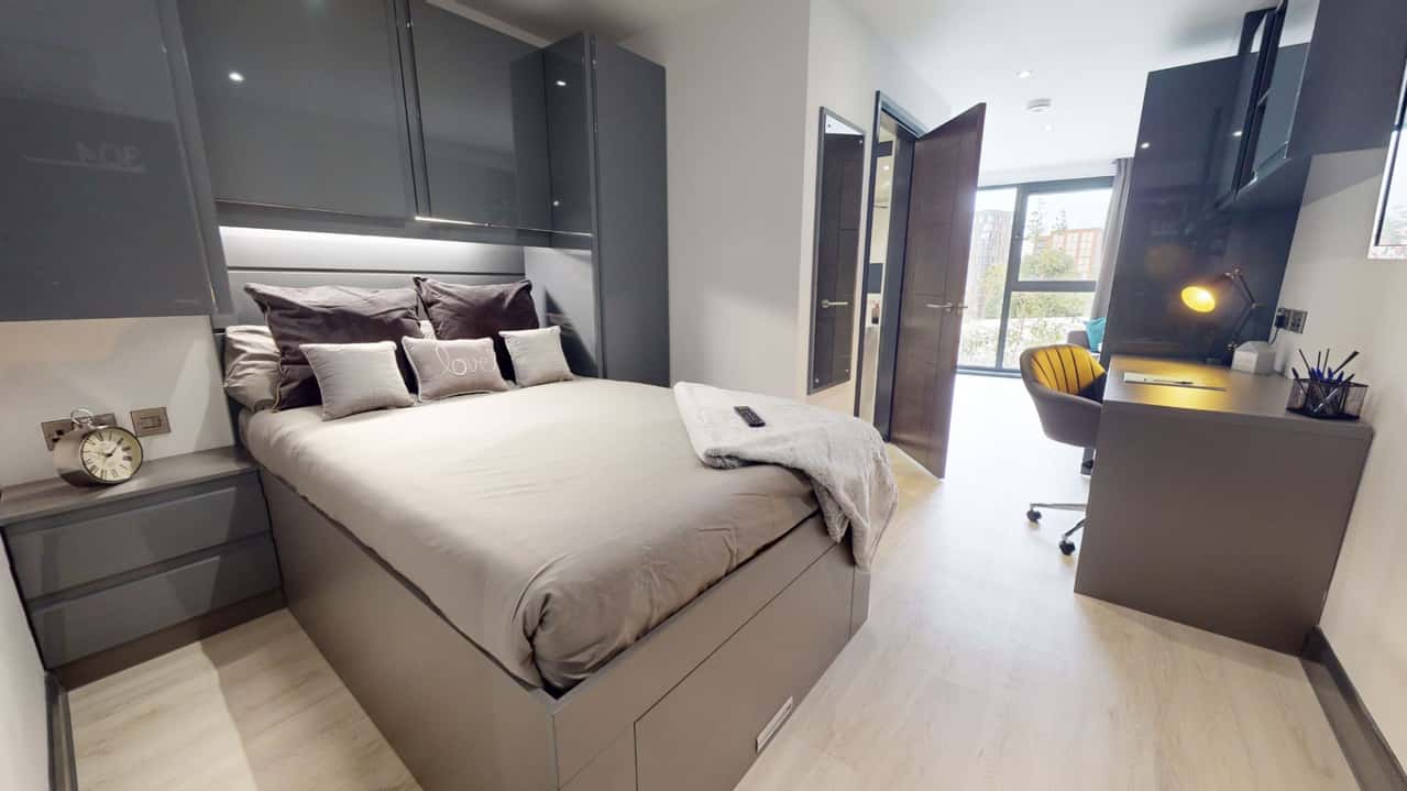 A stylish studio measuring around 25-26m² comes with a three quarter sized bed, dining area, ample storage, study desk and chair. The modern kitchenette comes with a fridge-freezer, microwave oven and hob. This studio also has a fully fitted en-suite containing a shower and stylish fittings. You will also have access to the cinema and games room, and a communal dining room. Room layout may differ.