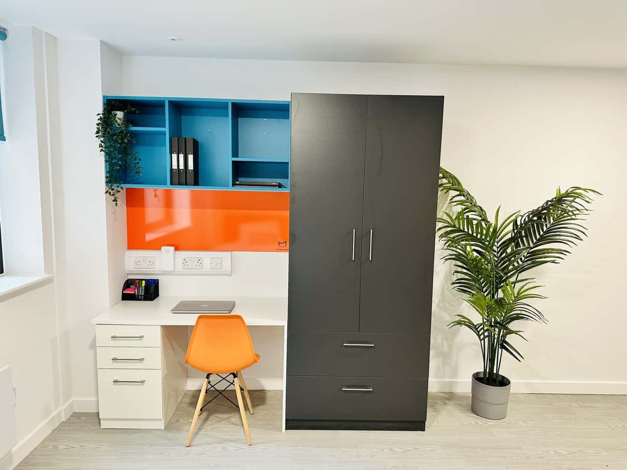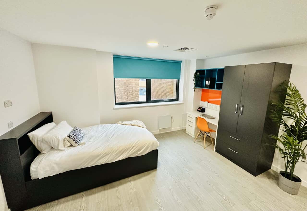 Embrace solitude in our sleek, modern studios (up to 19m2) designed for focused study. Featuring ¾ beds with storage headboards, each studio offers a wardrobe, shelving, a desk with drawers, and a large window for natural light. The kitchenette, en-suite, and breakfast bar provide all you need. Available on multiple floors.