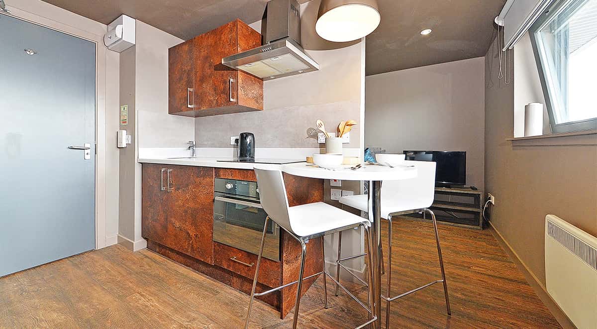 For those who want to level up, check out our fabulous studio accommodation, providing the perfect combination of luxury and independence for students. Equipped with your very own en suite bathroom and study desk and chair, you can appreciate sheer privacy with everything you need for maximum comfort. Get ready to sink into your soft, cosy double bed and catch some Netflix on your 32” flat screen TV. Also included is a fridge with an ice box, a 4-ring hob and a combination microwave, perfect for cooking up a delicious meal on an evening.
