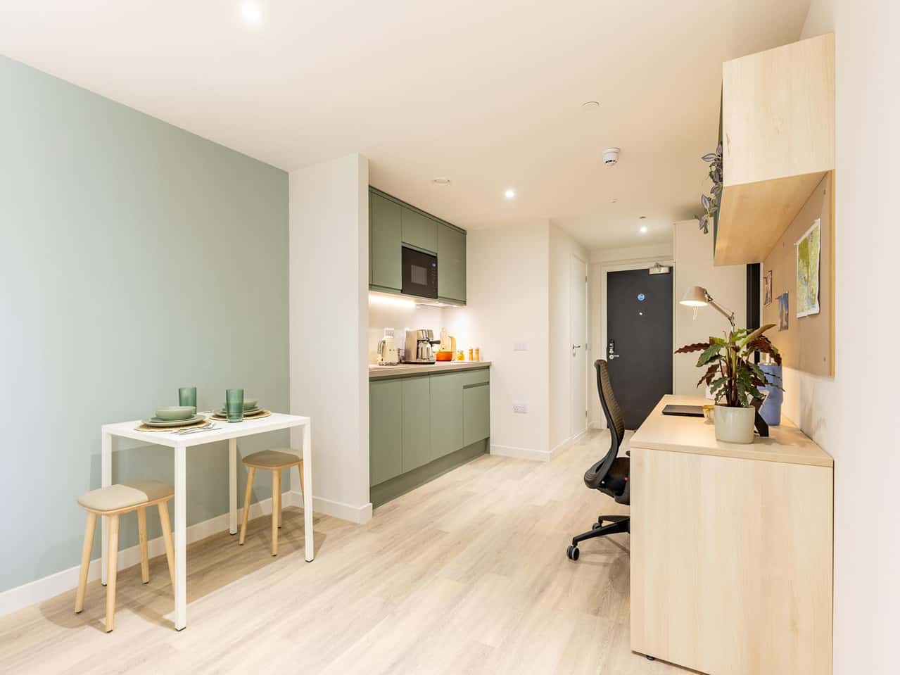 Step into the Premium Studio and discover a spacious, elegant living space of 25m². This thoughtfully designed studio includes a comfortable bed, a dedicated study area with a modern desk and chair, and a roomy cupboard to keep your essentials organised. Enjoy the privacy of your own bathroom and a chic kitchen, equipped with combi microwave, fridge-freezer, and hob, perfect for cooking up your favourite dishes whenever you wish. Ideal for those who crave a bit more room, the Premium Studio offers a blend of luxury and functionality to make every day feel special. Secure your Premium Studio today and experience luxury student living!