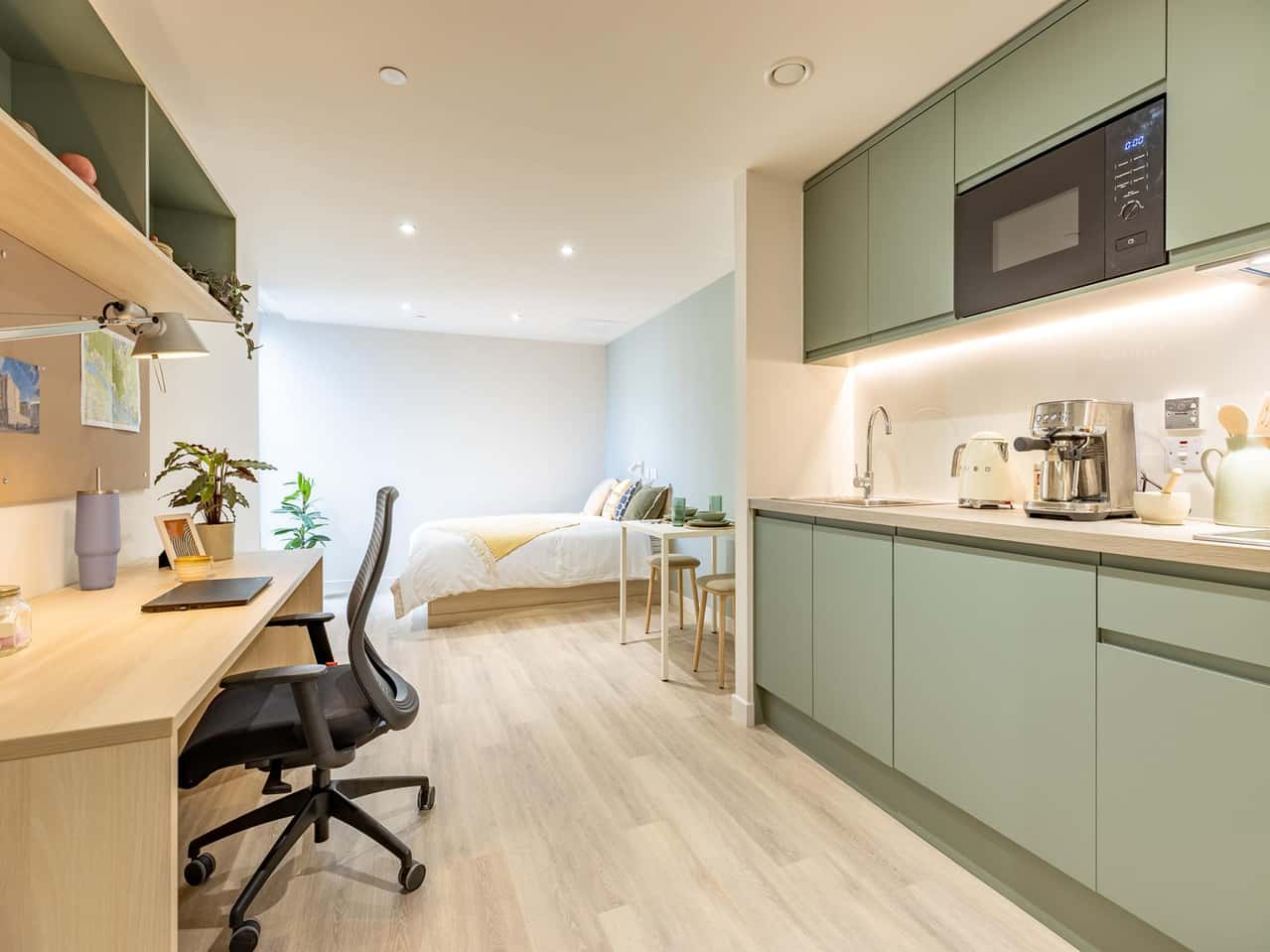 For those who love the luxury of space, the Premium Plus Studio is a prime choice at 25.3m². Situated on the ground floor, this studio offers a plush bed, a well-designed study desk and chair, and a generous cupboard for all your belongings. With your own bathroom for added comfort and a private kitchen fitted with combi microwave, fridge-freezer, and hob, you have the freedom to cook and relax in style. The exclusive front door access brings an extra layer of privacy and convenience, perfect for students seeking a premium living experience.