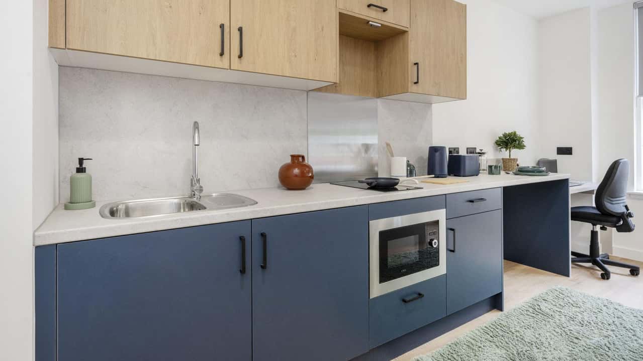 Upgrade your living experience with the Classic Plus Studio, offering all the perks of the Classic Studio with a little extra refinement. Featuring a study area, a cosy double bed with under-bed storage, and plenty of shelving and wardrobe space, this room is designed for both comfort and functionality. The private washroom and kitchen equipped with all essentials, including a 2-ring ceramic hob, microwave, and fridge-freezer, make independent living effortless. Secure your Classic Plus Studio today!
