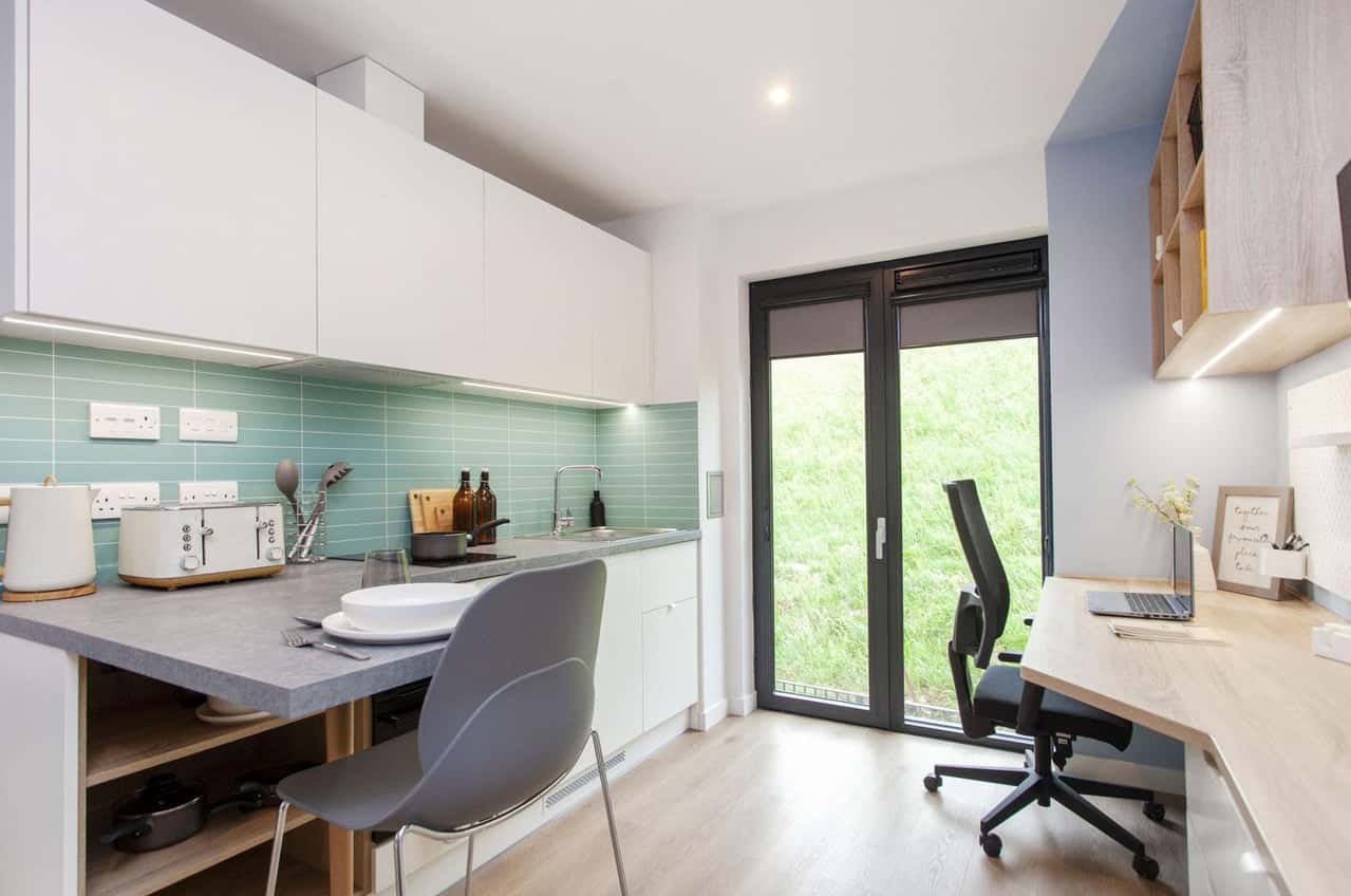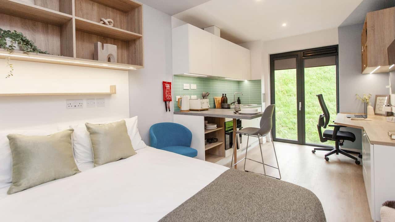 Relax and unwind in our Studio Plus (approx 18.00m² to 19.90m²), the perfect space with everything the modern student needs! Featuring a comfy double bed, lots of storage, your own private ensuite, you’re bound to fall in love from the moment you move in. Enjoy cooking in your own fabulous kitchen, which is equipped with brand new facilities! When it’s time to focus, crack on with university work at your own study desk and enjoy the peace with no distractions.