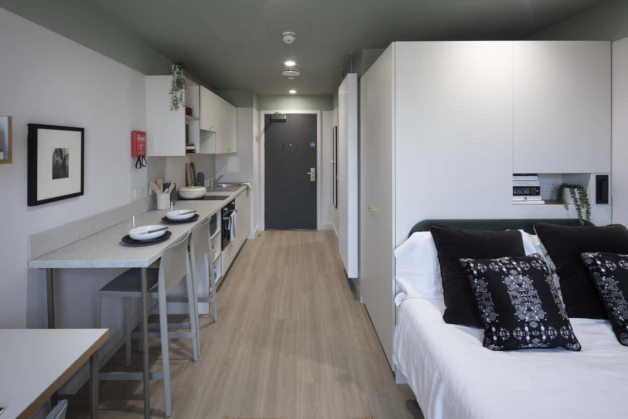 Our Bronze Studio apartment measures 17.37sqm and comes fully furnished with a cosy bed for you to have all the naps you can dream of, a private bathroom with a shower so you never have to wait for anyone else in the morning, as well as a living space for you to relax in after a day at uni. If you’ve got some work to get done, don’t worry about heading to the library. You can focus at your study desk with your own chair as well as a bookshelf to store all your degree reading. When it’s dinner time, cook up some tasty meals in your kitchen area with your own breakfast bar with stools. If you want to meet other students living in Edinburgh, our communal lounge is the perfect place, or we’re just a short walk from the city centre. Book now to guarantee your ideal student home!