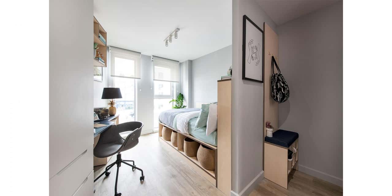 Experience luxury living in the premium en-suite room, complete with a small double bed and a dedicated study area. These rooms are available on the ground, 1st, 2nd and 3rd floors. With room sizes ranging from 11.8m2 to 12.5m2, this room offers ample space for relaxation and productivity. Stay organised with sufficient storage space, and enjoy the privacy of your own bathroom. Plus, you'll have access to an open-plan shared living, kitchen, and dining area, perfect for communal gatherings and shared meals. Book your room today!