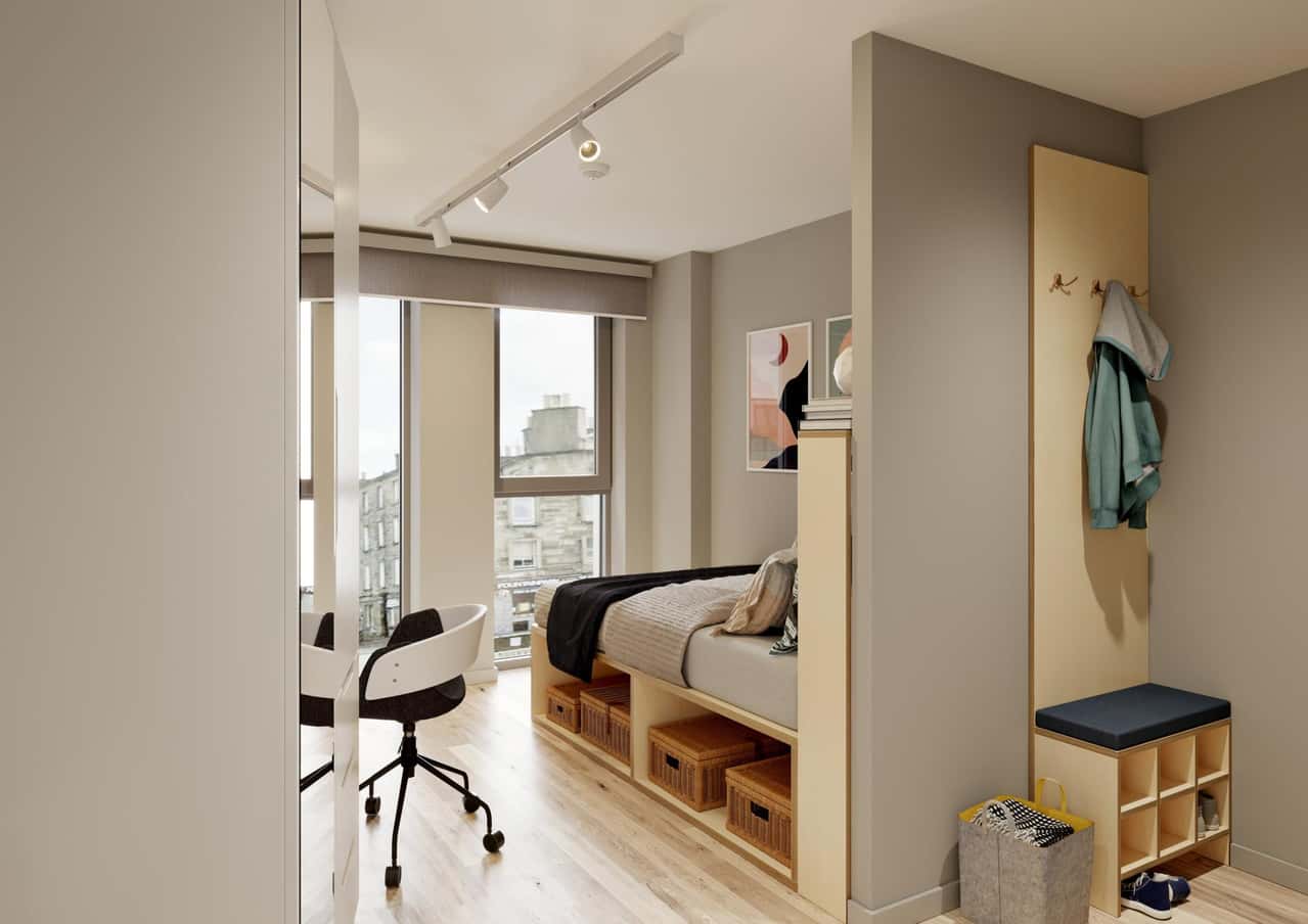 Enjoy comfort and convenience in the standard en-suite room, ranging from 11.8m2 to 12.5m2. Furnished with a cosy small double bed and a dedicated study area, this room offers the perfect environment for relaxation and productivity. Ample storage space ensures all your belongings are neatly organised, while the private bathroom provides added privacy. Plus, you'll have access to an open-plan shared living, kitchen, and dining area, ideal for socialising with flatmates. Book your room today!