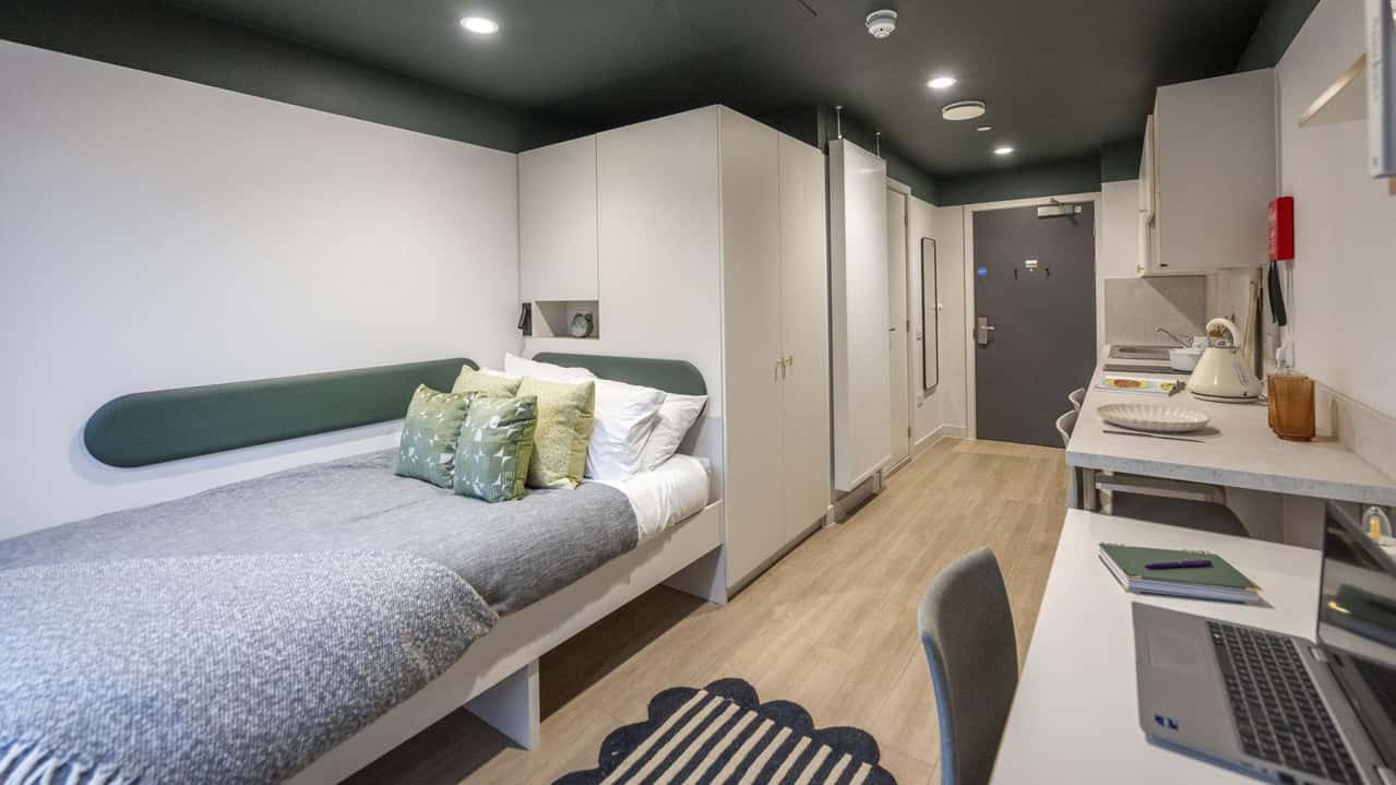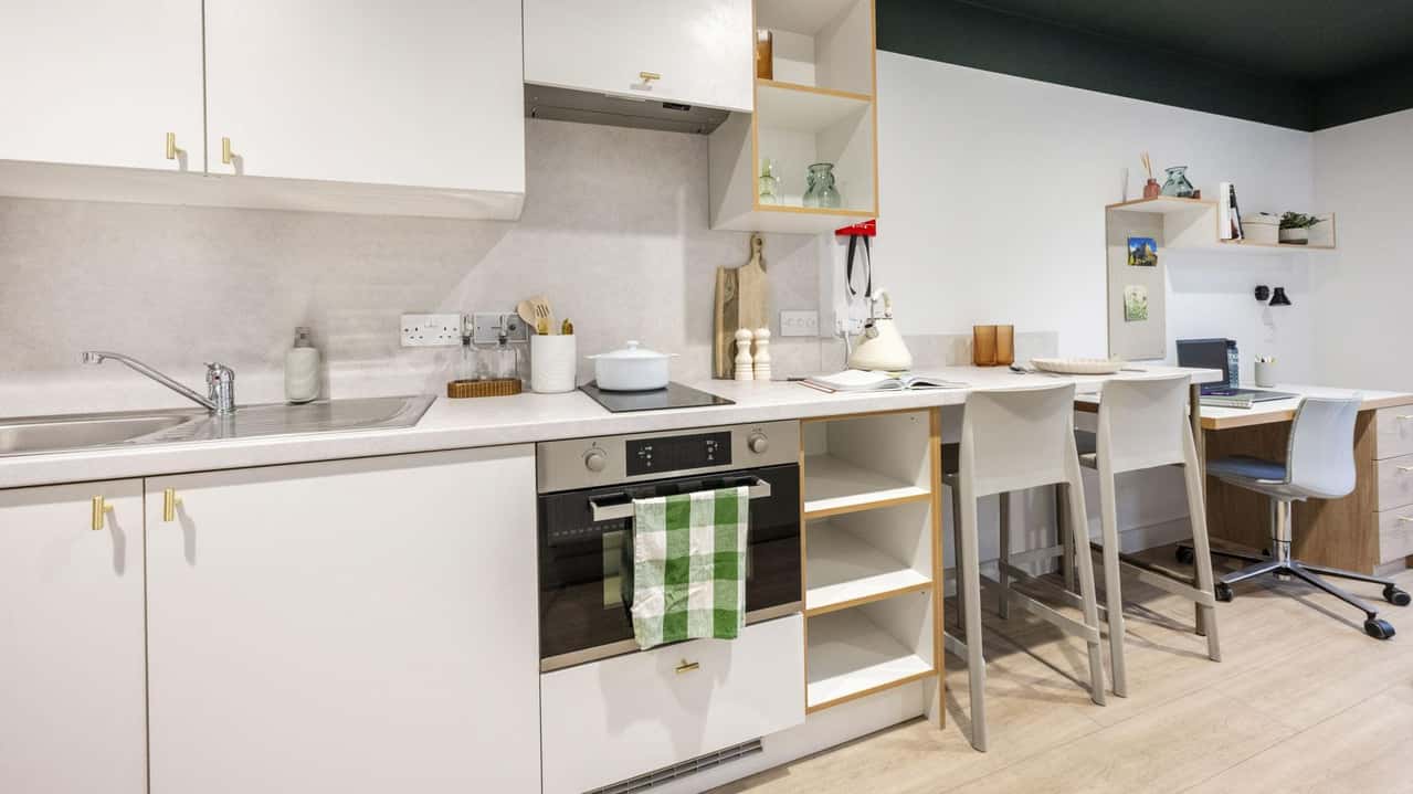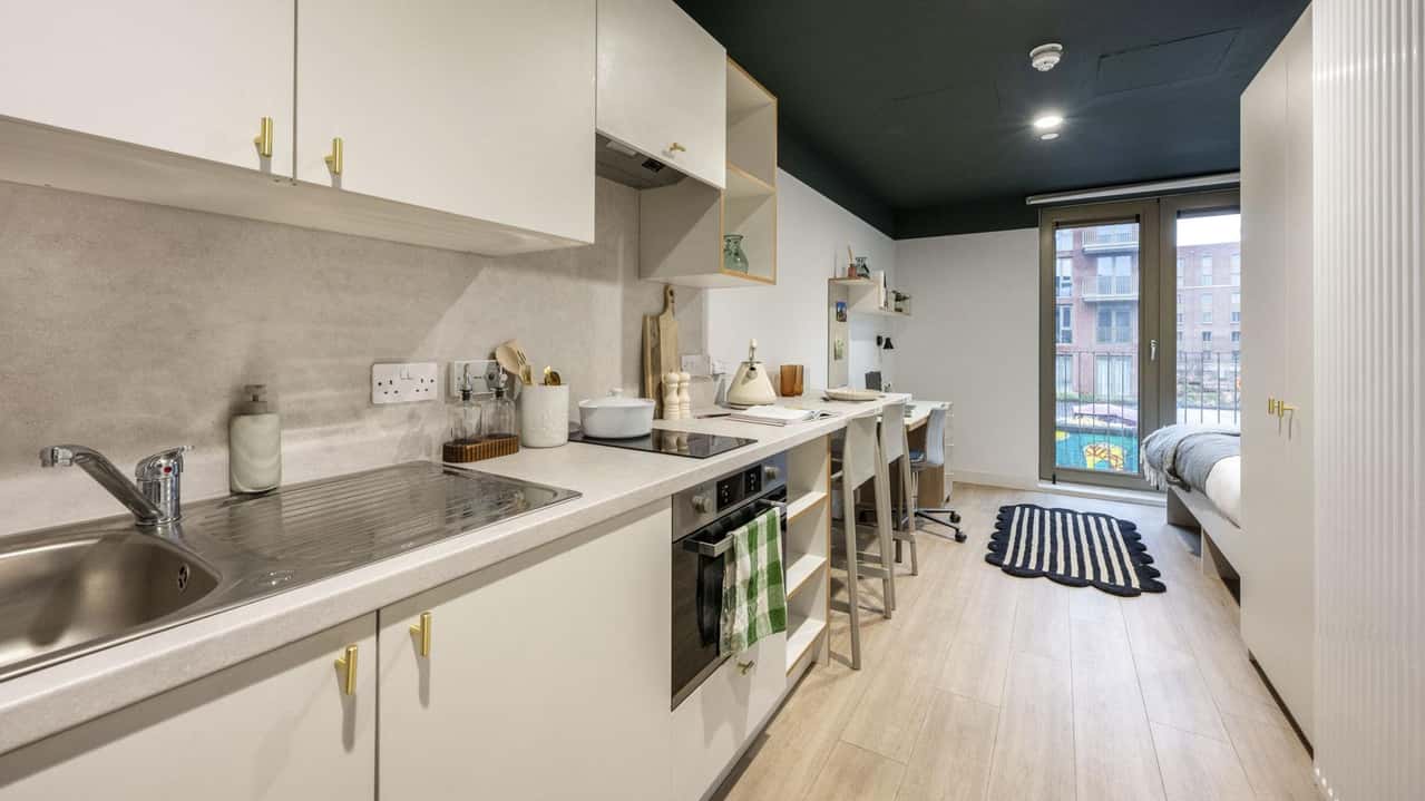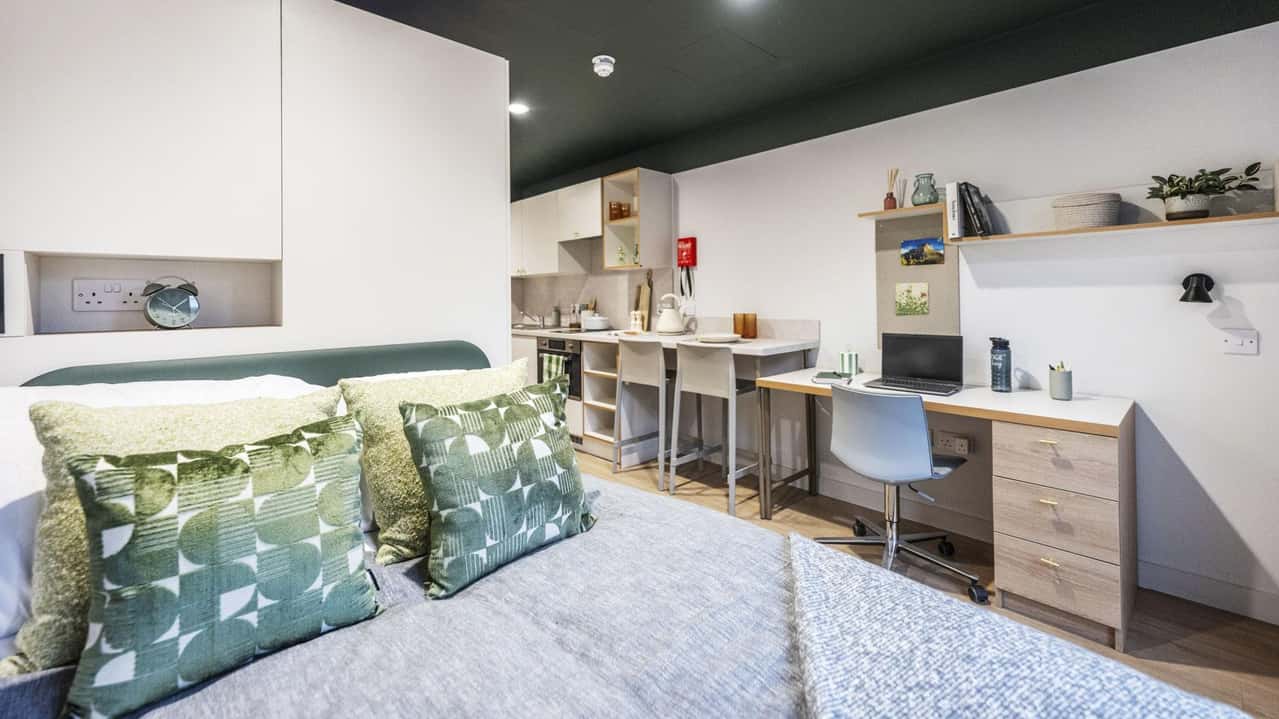 Our Silver Plus Studio apartments at The Keel Houses measure between 18.23sqm-18.79sqm and come equipped with all the modern furnishings you’d need, such as your own comfy bed, private bathroom, kitchenette and living space. Wi-Fi and bills are all-inclusive in the rent so you can focus on all the important things like socialising and unwinding after a busy day. Our Silver Plus Studios are located over the First and Second floors and offer great views over the Union Canal basin. Aside from your self-contained apartment, there are many communal spaces you can make the most of whilst staying here including our communal lounge, games and movie room, and our private dining room. These rooms will get booked up fast, book now to ensure your new home is sorted for the next academic year!