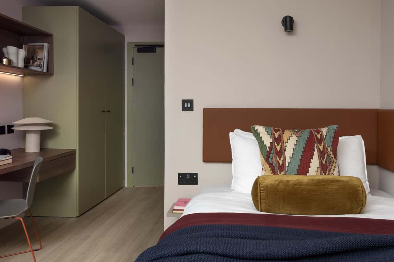 Enjoy a cosy, private space in our Classic Studio, located on floors 1, 2 and 3 with room sizes ranging from 19.1m² – 21.4m². This studio includes a comfortable small double bed with storage underneath, blackout window blinds, full length mirror, a lounge chair, a private kitchen equipped with integrated fridge, microwave, kettle, toaster, a sleek private bathroom with large shower, and a dedicated study desk with storage and a chair for productive study sessions. Double wardrobe is provided to keep your belongings organised and your room clutter-free. You’ll also enjoy handy extras like a Grab & Go breakfast, unlimited hot drinks, and a fully stocked vending machine for snacks on the go. Ideal for students who enjoy independence with convenience. Book your Classic Studio now and make it your perfect student space!
