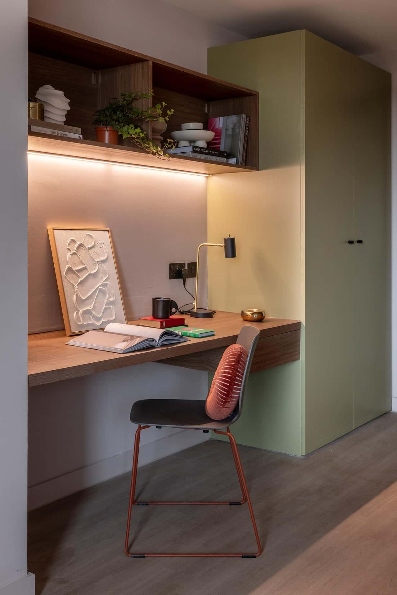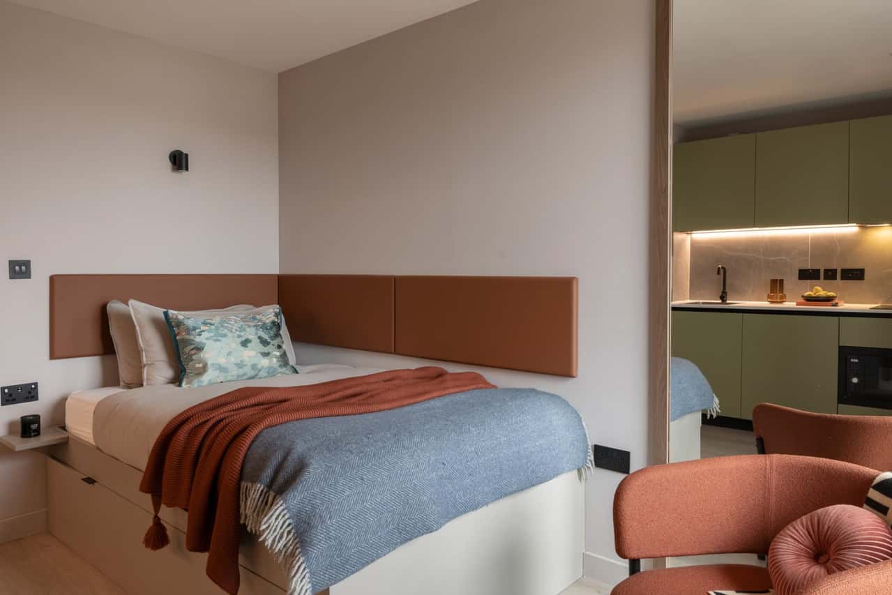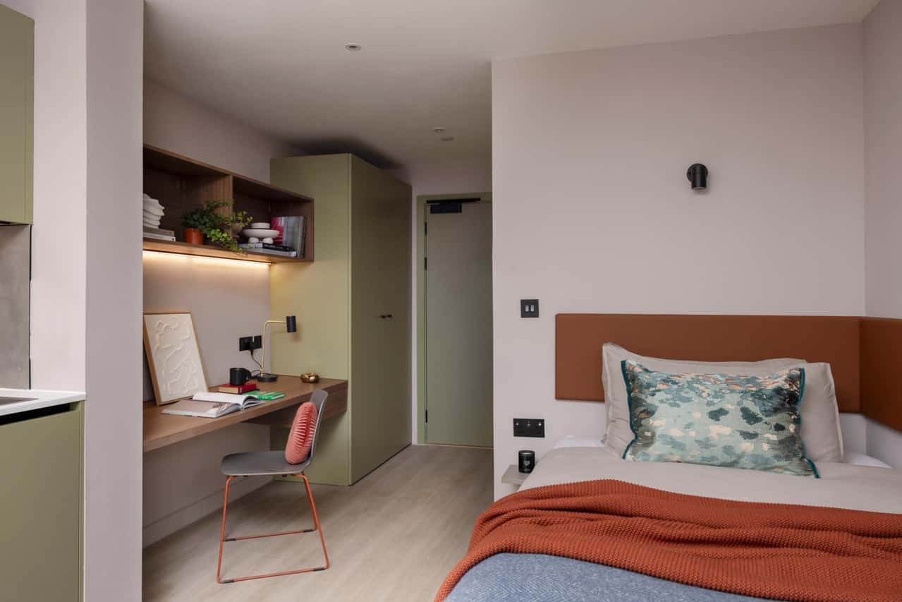 Located on floor 4 and 5 (top), the Premium Studio offers a spacious 19.1m² - 21.4m² layout designed for comfort and style. This studio includes a comfortable small double bed with storage underneath, blackout window blinds, full length mirror, a lounge chair, a private kitchen equipped with integrated fridge, microwave, kettle, toaster, a sleek private bathroom with large shower, and a study area with a desk and chair to help you stay focused. With double wardrobe to keep your space neat and tidy, the Premium Studio is ideal for students who value luxury and functionality. You’ll also enjoy handy extras like a Grab & Go breakfast, unlimited hot drinks, and a fully stocked vending machine for snacks on the go. Reserve your Premium Studio now for a top-floor living experience! Below, you can see the amazing views from our photo gallery (views vary depending on the location of the room).