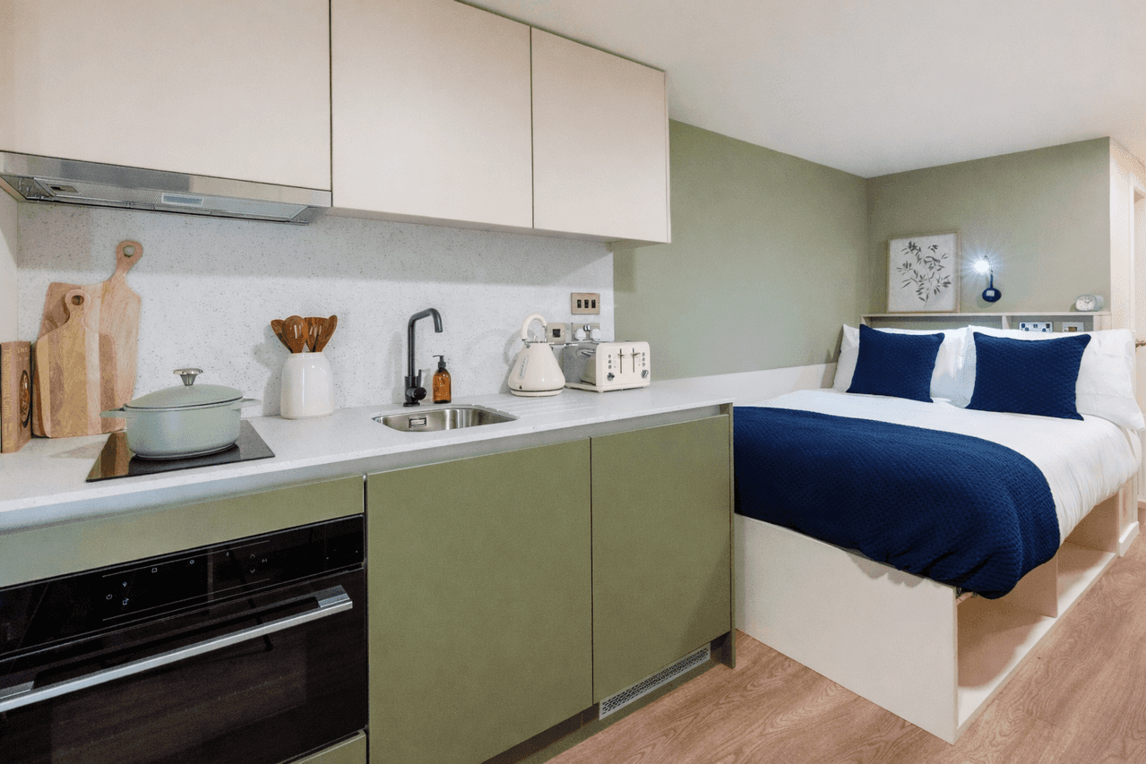 Indulge in 18.1-18.8 square metres of refined studio living on the ground floor, where your sleek self-contained space delivers complete independence. Your Silver Studio features a sumptuous bed, a generous personal study area perfect for demanding coursework, a private ensuite bathroom, and an innovative kitchenette designed for effortless living. The versatile layout creates distinct zones for work, rest, and entertaining, and provides the premium aesthetic The Malt Works is known for. High Speed Internet powers your academic success, while the vibrant Cinema Lounge offers immersive entertainment and the inviting Communal Lounge allows for increased social connection. More style. More you at The Malt Works, where Edinburgh studio living combines quality, comfort, and community.