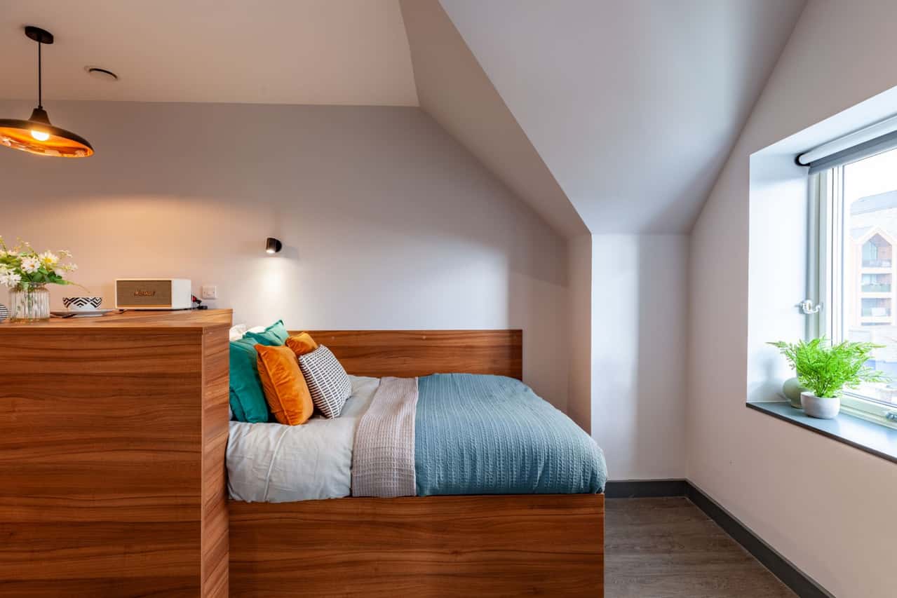 Our comfortable Deluxe Studios range from 17-23m2, and have been designed with the modern student in mind. Boasting luxury furnishings and sleek aesthetics, prepare to feel like you never want to leave your room! Relax in your cosy bed, or knuckle down on your desk with your university deadlines. Fancy a bite to eat? Show off your cooking skills in your very own chic kitchen, with all the amenities you could need to impress your pals.