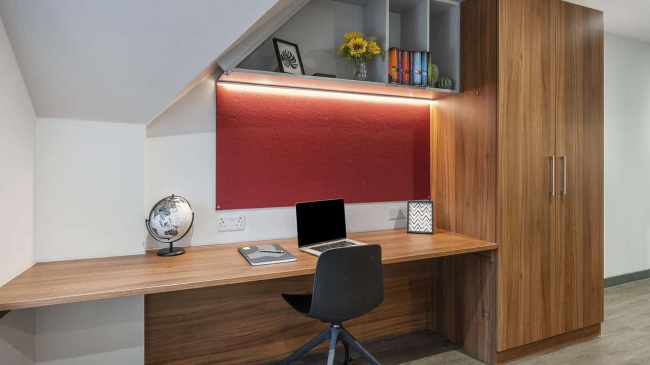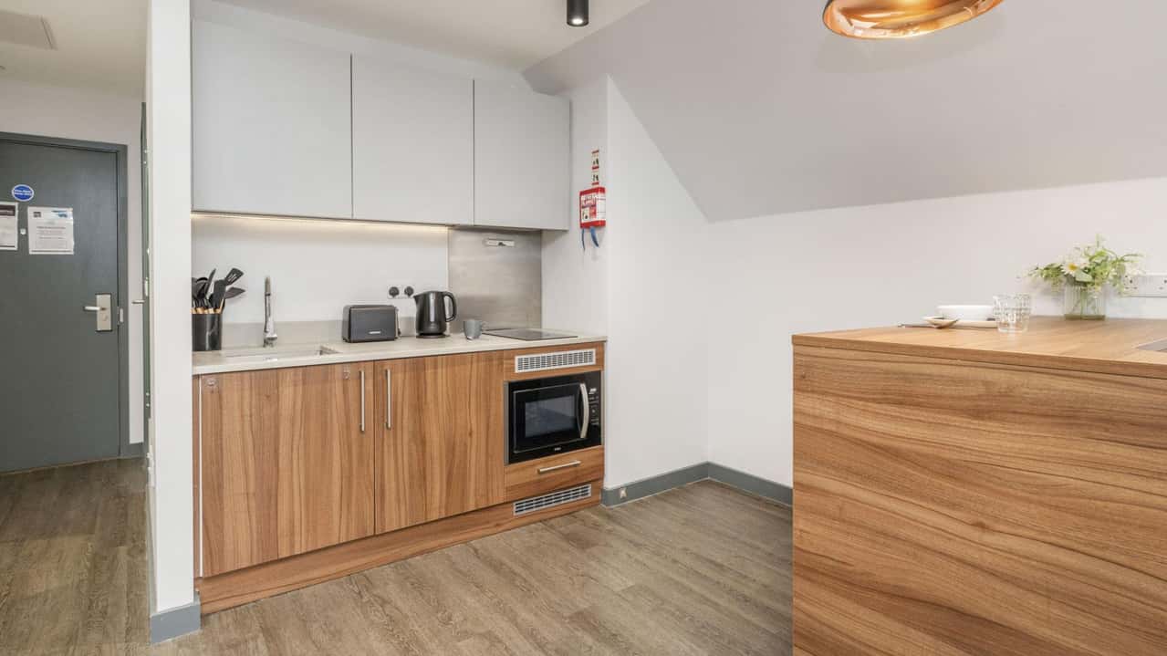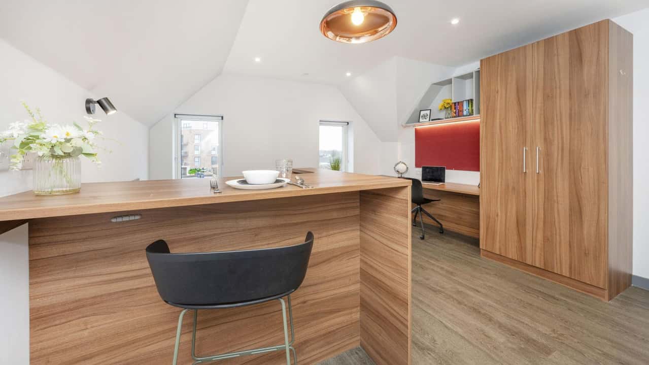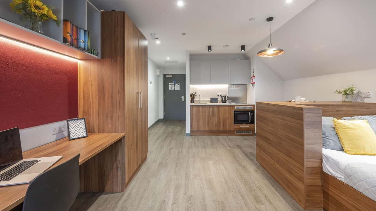 For students wanting a modern and chic student apartment furnished with all the amenities they could need, our Deluxe Plus Studio is the perfect option. Slightly larger in size than our Deluxe option, this room style features a snug double bed for resting up after a busy day, a large study desk for cracking on with work, as well as your own fully-equipped kitchen for cooking up something tasty. Some studio styles at Straits Garden are designed as accessible rooms with wet rooms, get in touch to discuss more.