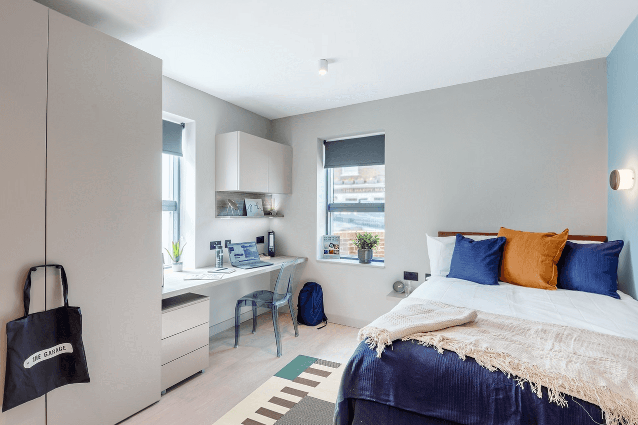If you’re looking for a stylish studio, the Deluxe Studio is an excellent choice, offering 24m² of self-contained space. Inside, you’ll find a ¾ size double bed with under-bed storage, a study desk with drawer space and chair, a pinboard, a wardrobe, and a full-length mirror. The kitchen area, equipped with a 2-ring hob with extractor, microwave oven, integrated fridge with freezer compartment, and a dining table with chairs, provides the perfect setup for independent living. The private en-suite bathroom features a shower and WC. Book your Deluxe Studio today for a stylish and spacious student home!