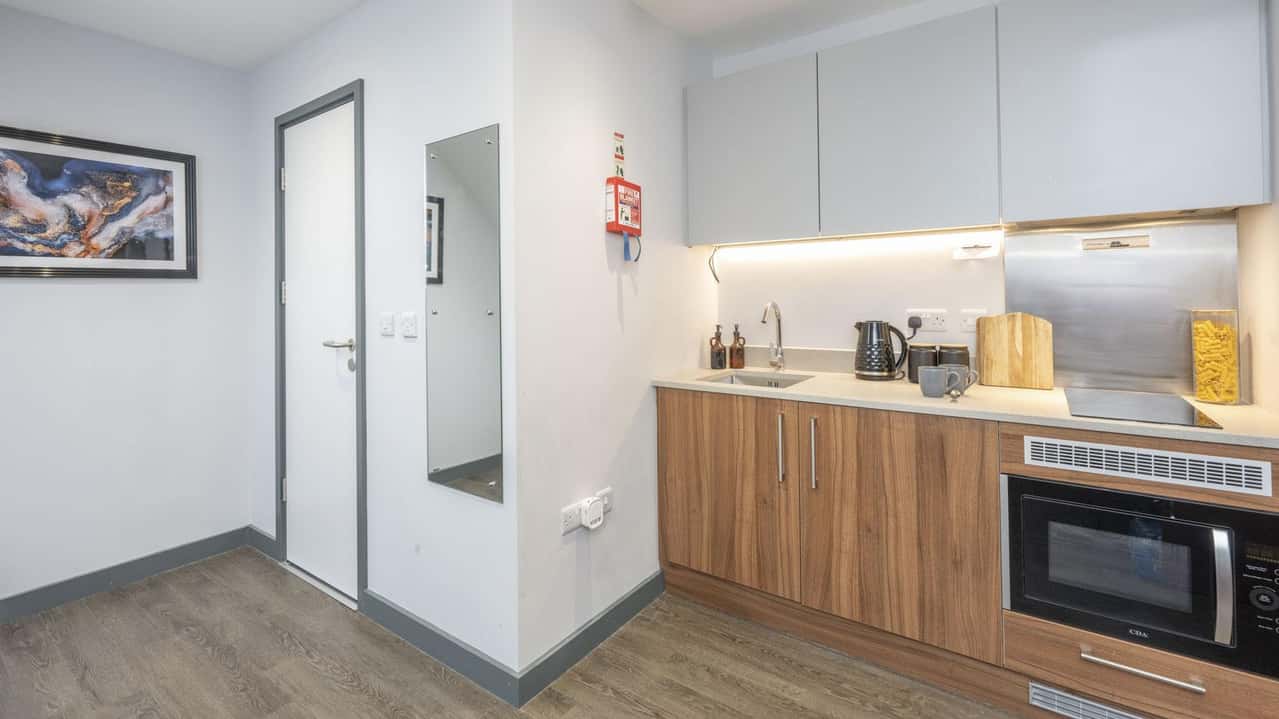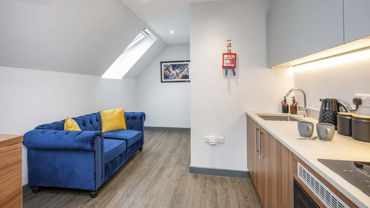For students wanting a modern and chic student apartment furnished with all the amenities they could need, our Executive Studio is the perfect option. Slightly larger in size than our Deluxe option, this room style features a snug double bed for resting up after a busy day, a large study desk for cracking on with work, as well as your own fully-equipped kitchen for cooking up something tasty. Some studio styles at Straits Garden are designed as accessible rooms with wet rooms, get in touch to discuss more.