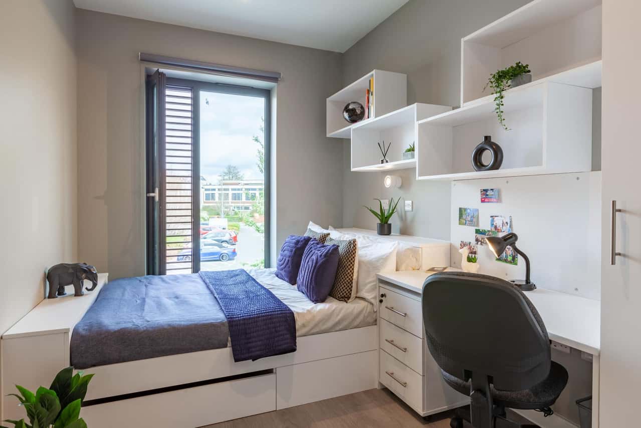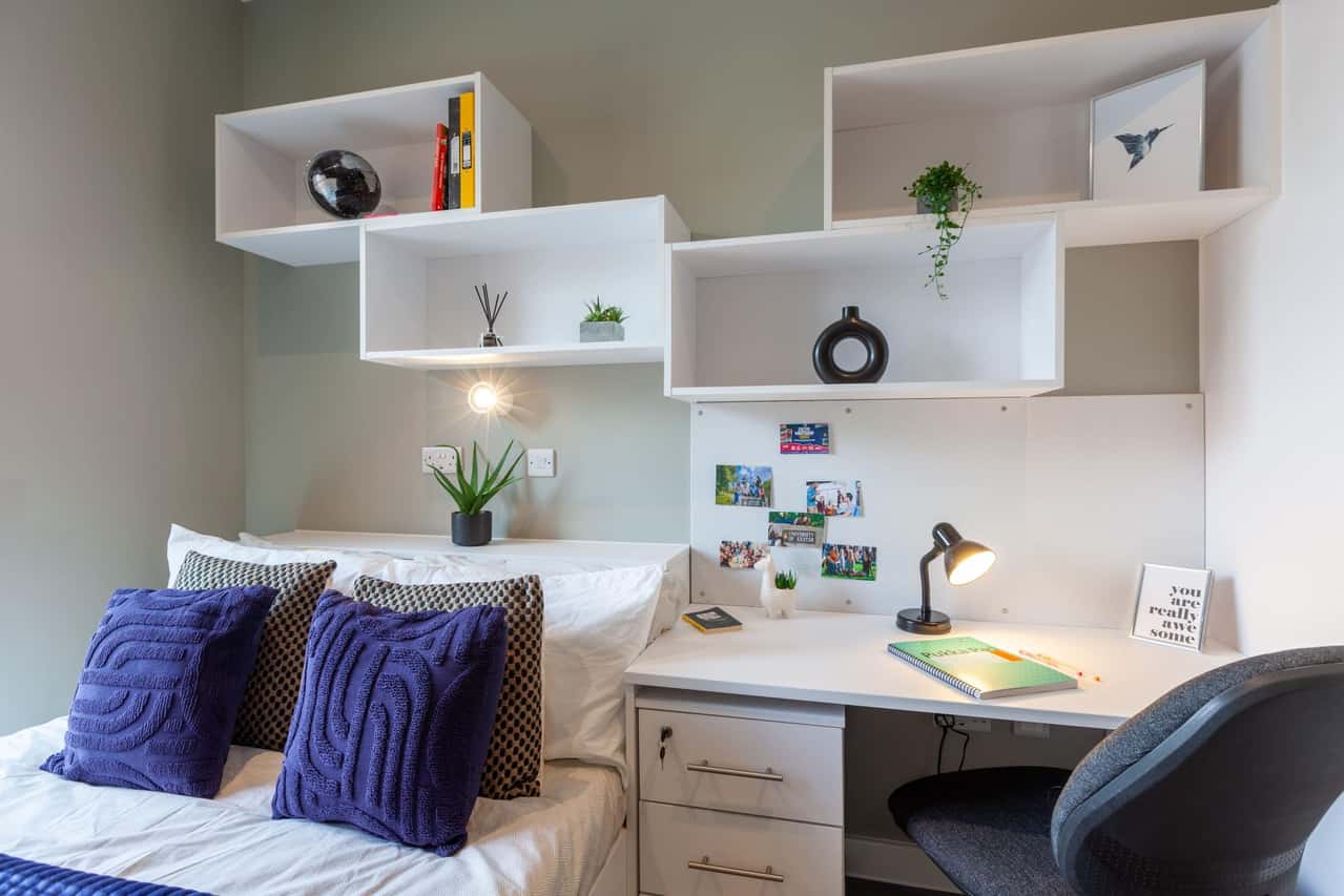 It’s part of a cluster apartment of 4 or 6 students, who will share a modern kitchen and living area, equipped with state of the art facilities. Measuring 13m2, these rooms are furnished with a cosy double bed, an ensuite bathroom, wardrobe, shelving and a comfortable desk area for you to complete all your work.