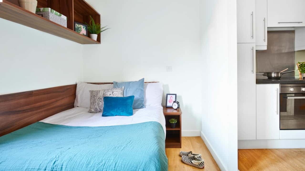 The Premium Studio provides a stylish and private living space. This studio includes a 3/4 double bed, wardrobe, bedside table, and shelving unit. The central heating ensures comfort throughout the year. With a large desk and chair, bookshelves, and a noticeboard, it’s perfect for studying. Enjoy the comfort of a private ensuite washroom. The open-plan kitchen is equipped with a fridge/freezer, microwave, toaster, kettle, oven, and hob. The lounge area with a chair and Freeview TV completes the space. Book your Premium Studio today!