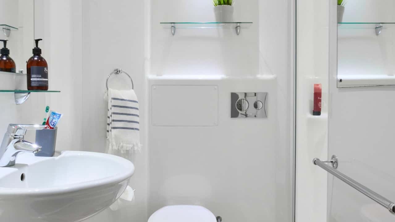 Our 2 Bedroom apartment offers a cozy room at 13m². . With a wardrobe and bedside table, you’ll have ample storage. The desk, chair & noticeboard provide a dedicated study area. The ensuite washroom offers privacy and convenience. The shared kitchen between yourself and one other resident includes a fridge / freezer, microwave, toaster, kettle, oven, and hob.