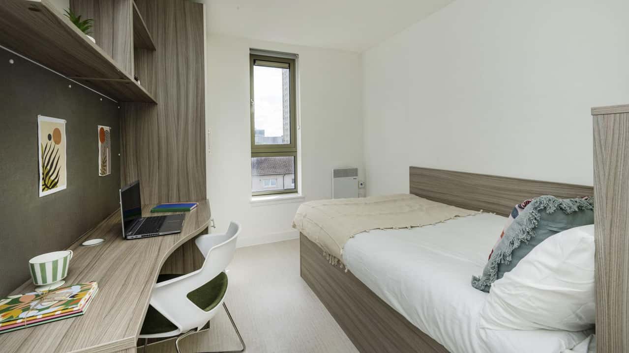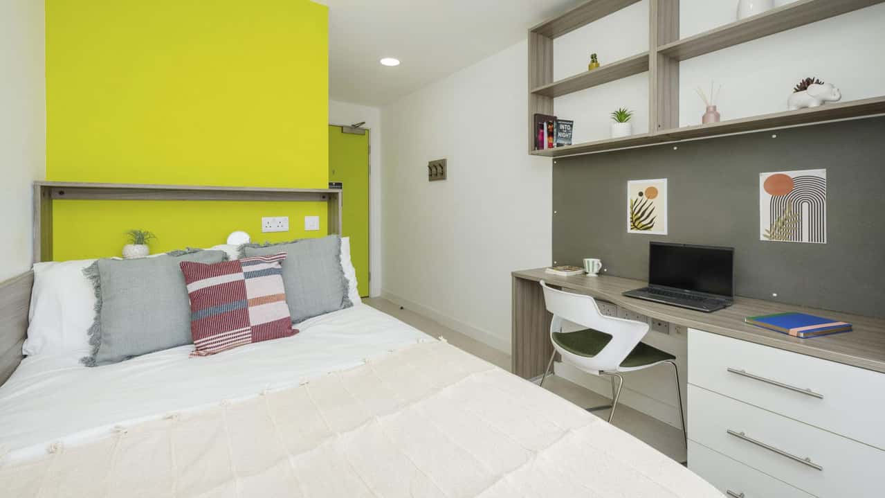 Experience comfortable living with our Platinum Two Bed Apartment. Each room includes a small double bed, a private en suite washroom, and ample storage. The apartment features a shared kitchen and living area, perfect for socialising and enjoying meals with a roommate. Designed for students who appreciate a bit more space and privacy, this apartment offers a modern and comfortable living environment, combining functionality with a touch of luxury. Ideal for friends or couples, it’s a perfect choice for a great student experience. Book your room in the 2-bed apartment today!