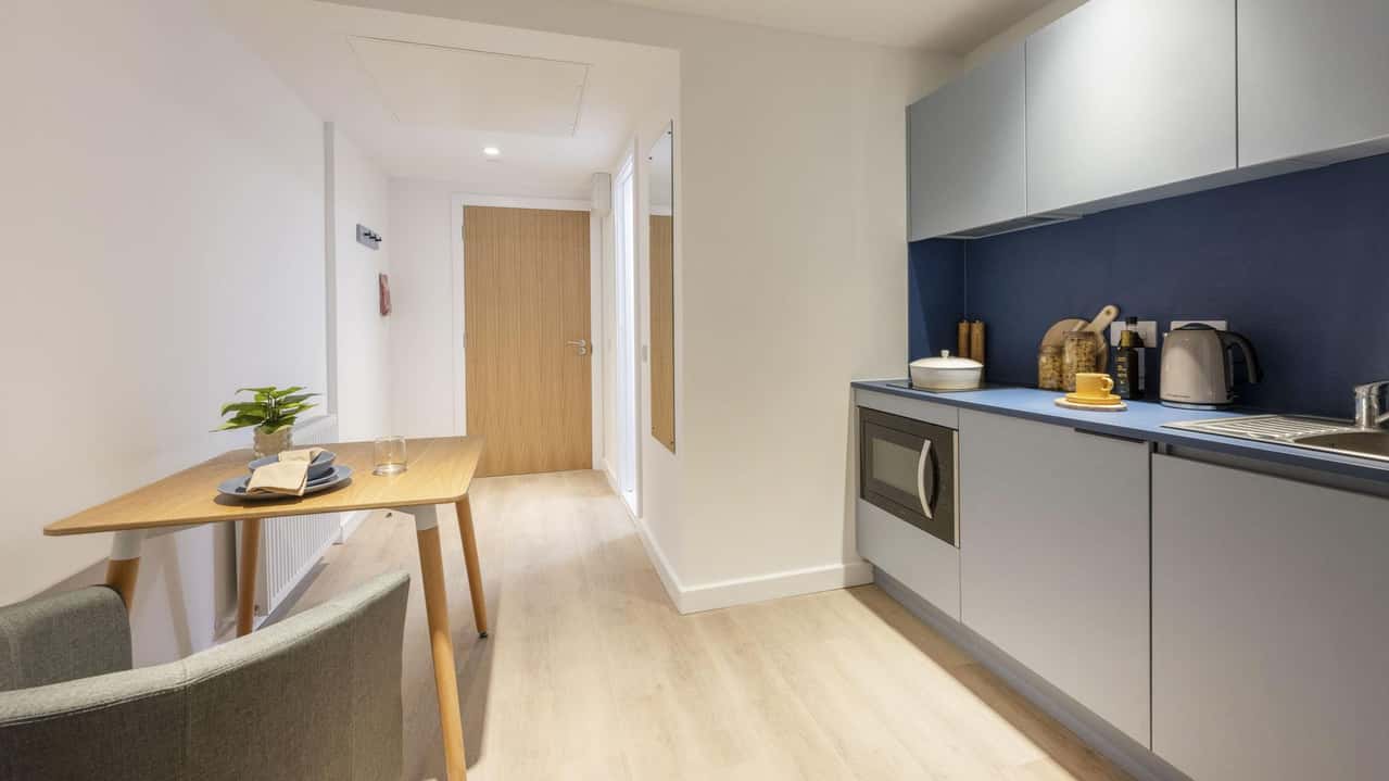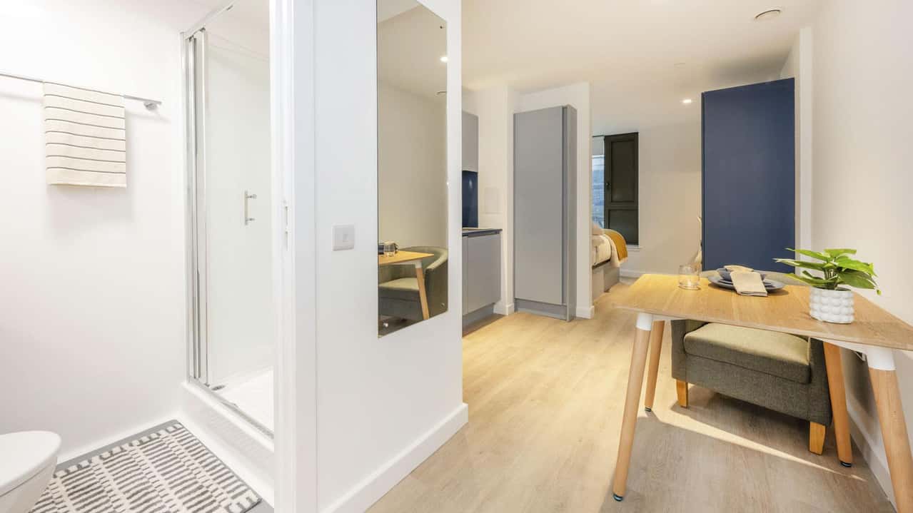 Indulge in the Premium Studio, a statement living choice on Floors 1-7. With expansive measurements of 21m2 to 22.6m2, this space is noticeably larger, offering more room to relax and study. This sleek design includes a private en-suite and a full-featured kitchen alongside your comfortable bed and personal study area. The all-inclusive package covers all utility bills and high-speed internet. Elevate your downtime with access to the Cinema Lounge for movie nights or the Co-Working Space for focused moments. Experience the height of elegance in the centre of Glasgow's student community at St. Vincent Studios.