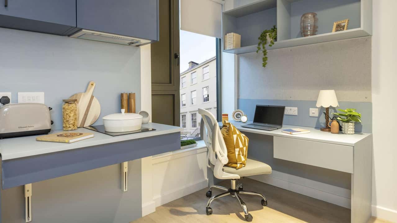 The Accessible Studio provides an innovative and thoughtfully designed living space on Floors 1 and 2. Ranging from 26.7m2 to 27.1m2, these versatile studios are tailored to ensure maximum comfort and accessibility, featuring a bespoke kitchen and a luxury en-suite bathroom alongside a cosy living space. Enjoy the convenience of all utility bills included and high-speed internet as standard. Residents can also fully utilise all of our amenities, from the Gym to the Communal Lounge and Rooftop Terrace. This premium accommodation ensures a balance of independence and support, all within the luxurious setting of St. Vincent Studios.