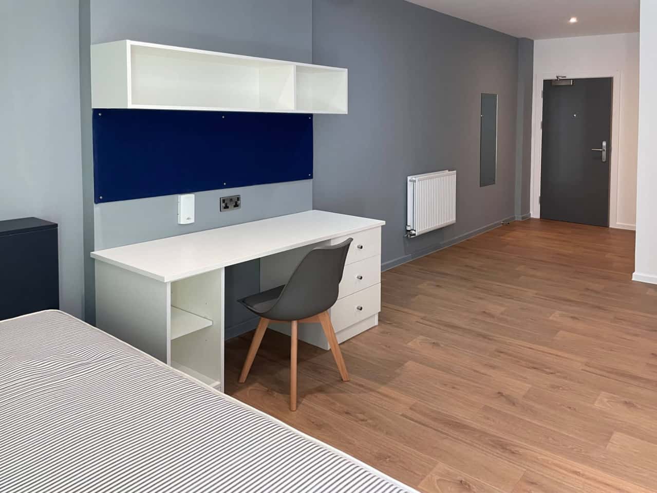 Our Premium Plus Studio is our largest room style at The Bridge. Within your self-contained apartment measuring between 23 – 25 sq m you'll have a snug small double bed, desk area for cracking on with studying, a private bathroom all to yourself as well as a fully fitted kitchen for cooking up your meals. Whilst staying here, you can make the most of our lively social spaces including a cinema room, communal lounge, gaming room and a fully soundproof music room. If this sounds like the student apartment for you, book now! **Dual occupancy available. for an extra £50 per week and valid only to full time students.