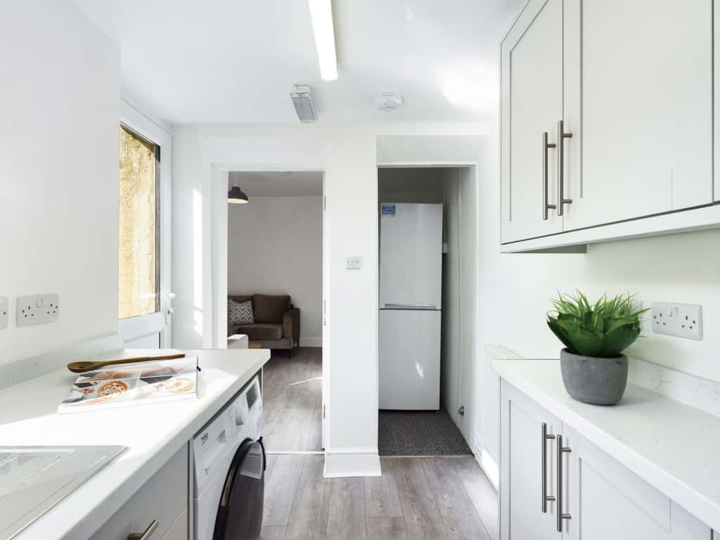 The bright, sociable living room features comfortable sofas and a large flat-screen TV - perfect for relaxing or catching up with housemates. The kitchen comes fully equipped with modern appliances, multiple fridges, and a washing machine, providing everything you need for daily life.