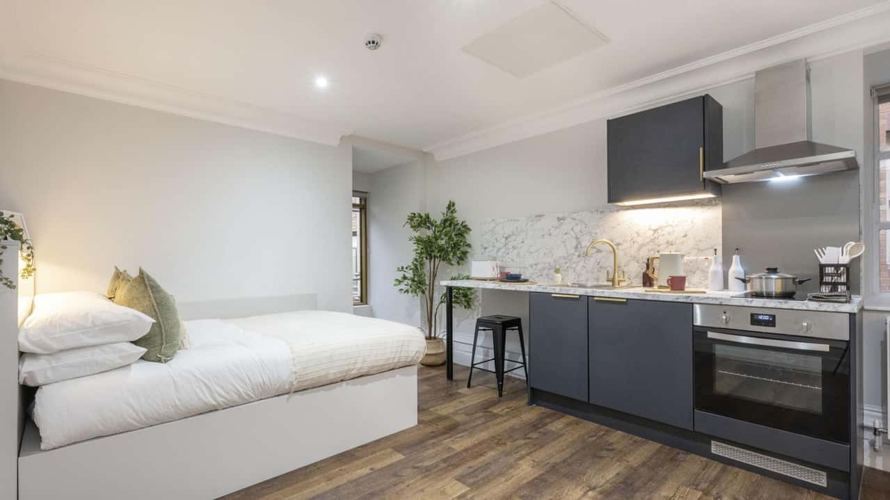 With a generous size of 29.9 sq. m and all the essentials for a comfortable stay, the Deluxe Studio Plus is fully furnished. Inside, you'll find a desk to keep your stuff organised, a cupboard for lots of storage, and a cosy bed for restful nights. This studio ensures a tidy living space by providing a clear separation between the kitchen and the main room. There's also a tiny dining area adjacent to the kitchen, which makes for a flexible area for unwinding and enjoying meals. This studio provides you with a warm and functional home for your academic journey—the ideal balance of space and utility.