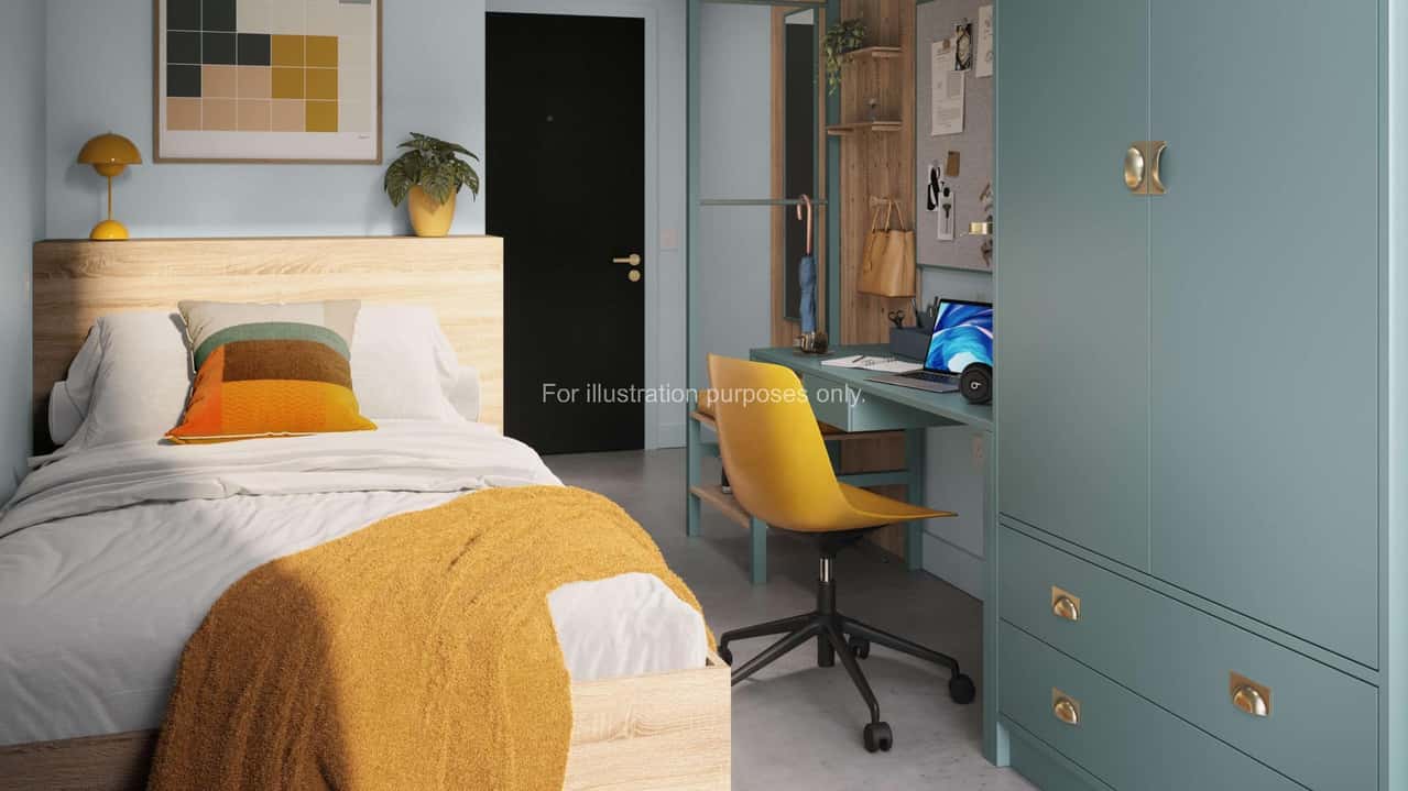 Spanning 18.8 to 19.6 square metres, the Accessible Ensuite, located on floors 1 to 2, is designed for comfort and ease. The room invites you with a cosy bed that promises restful nights and a private bathroom. A well-lit study desk area makes it easy to stay focused on assignments, while ample storage keeps your space organised and clutter-free. The shared kitchen, equipped with essentials, is a great space to prepare meals and mingle with flatmates. Reserve your Accessible Ensuite today and step into a world of convenience tailored just for you.
