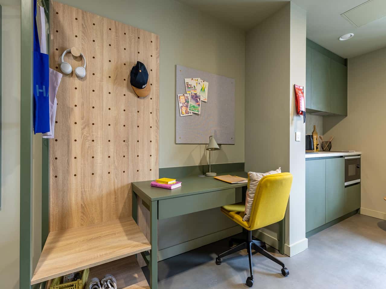 To stay focused in work-mode, our study area is equipped with an oversized desk and drawer, pinboard and ergonomic study chair.