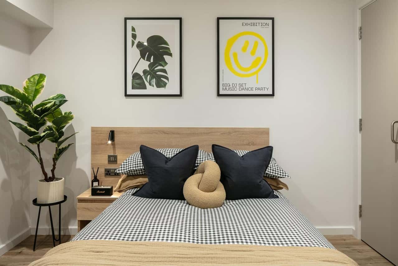 Each studio is a spacious 20 square metres in size, is fitted with acoustic flooring to keep things quiet, and includes: a compact double bed and mattress, large LCD smart TV, a wardrobe and plenty of storage space, study desk & chair, kitchenette and ensuite shower room. Your kitchenette is fitted with a fridge with freezer shelf, 2-ring induction hob, microwave-oven and lots of cupboard space to store your things.