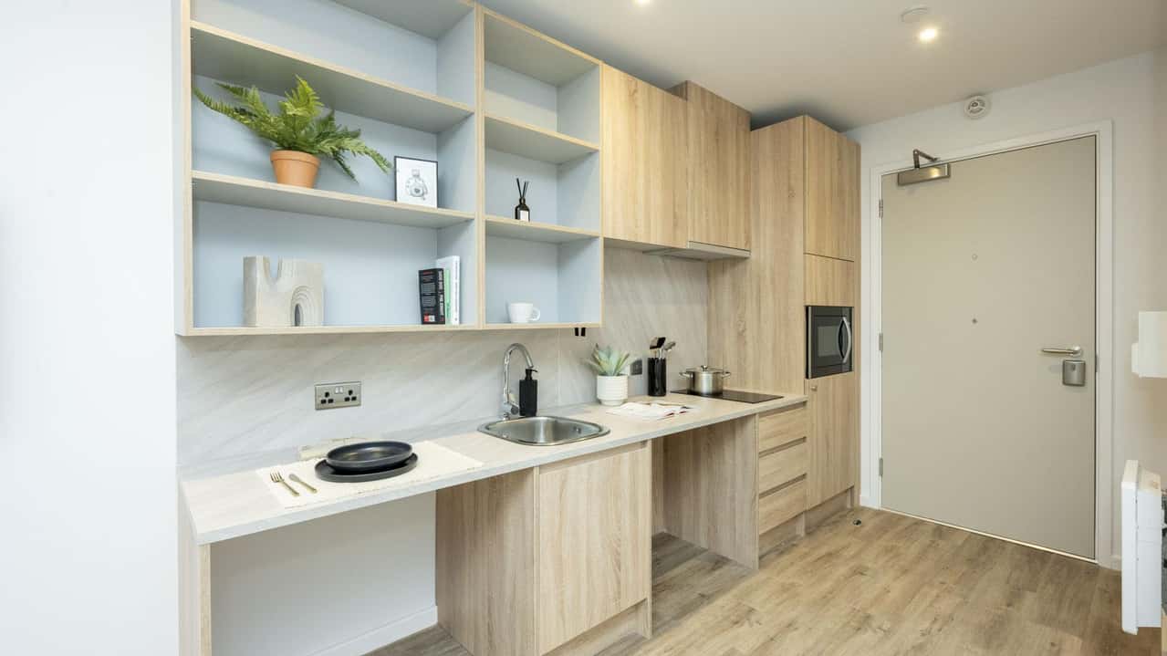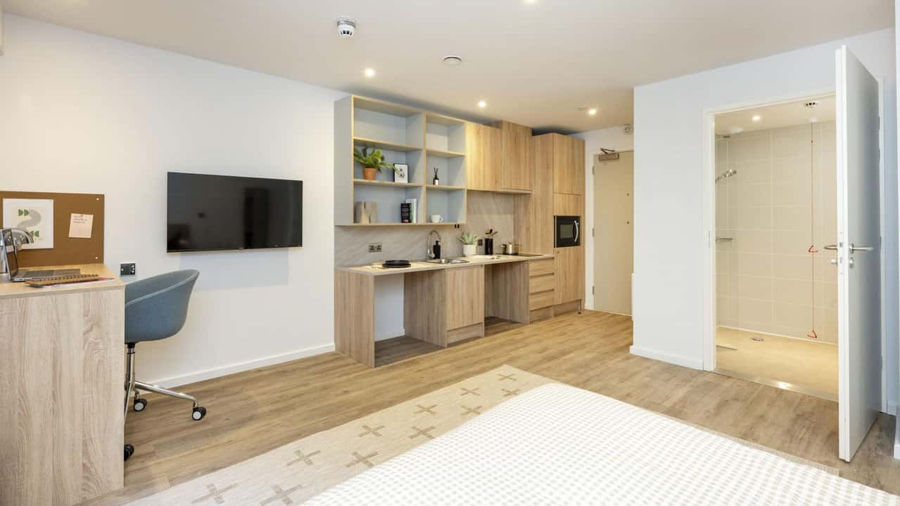Each studio is a spacious 27 square metres in size, is fitted with acoustic flooring to keep things quiet, and includes: a compact double bed and mattress, large LCD smart TV, a wardrobe and plenty of storage space, study desk & chair, breakfast bar and stool, kitchenette and ensuite shower room. Your kitchenette is fitted with a fridge with freezer shelf, 2-ring hob, microwave-oven and lots of cupboard space to store your things.