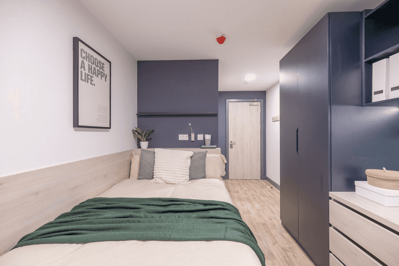 Situated on higher floors (16-18), the Classic Plus En-suite provides modern student living with fantastic views. Ranging from 12.72m² to 13.38m², these rooms feature a small double bed with storage, a study area, wardrobe, bookshelf, and an en-suite bathroom. The shared kitchen and lounge are ideal for socialising and relaxing, offering a dining space, a TV, comfortable sofas, and essential kitchen appliances, including two ovens and a fridge/freezer. If you’re looking for a vibrant, high-floor setting with excellent communal spaces, this is the perfect choice. Book your Classic Plus En-suite today!