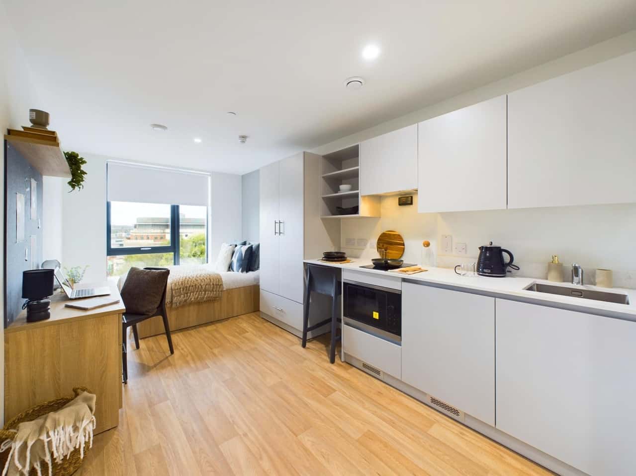 These spacious 25sqm studios with wet room are located on floors 1 and 3. You'll find a comfortable ¾ bed, study area, and ample cupboard space. The kitchen is fully equipped with everything you need and ready for use! Inside our building, you can discover communal spaces designed for fun and relaxation. Socialise in the lounge, challenge your friends in the games area, hit the books in the private study zone, or catch the latest movies in the cinema room. Book your room today so you don't miss out!