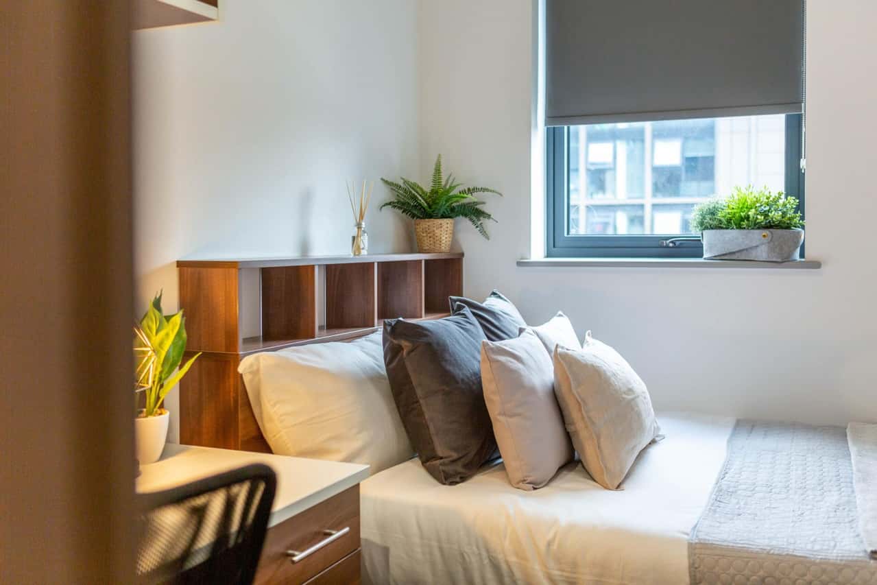 The Standard Plus Ensuite at The Foundry delivers enhanced comfort for your Leeds university experience. This well-designed room features a double bed with under-bed storage for maximum organisation, a wardrobe to store your essentials, a dedicated study area for smashing your coursework, and your own private en-suite bathroom. Share a great kitchen with your flatmates, creating opportunities for cooking together and making lifelong friendships. All-Inclusive Utility Bills keep finances straightforward, while High Speed Internet ensures you're always connected. When you need a break, the dedicated Study Space provides quiet zones for focused revision, or swing by the Games Hub for some healthy competition.