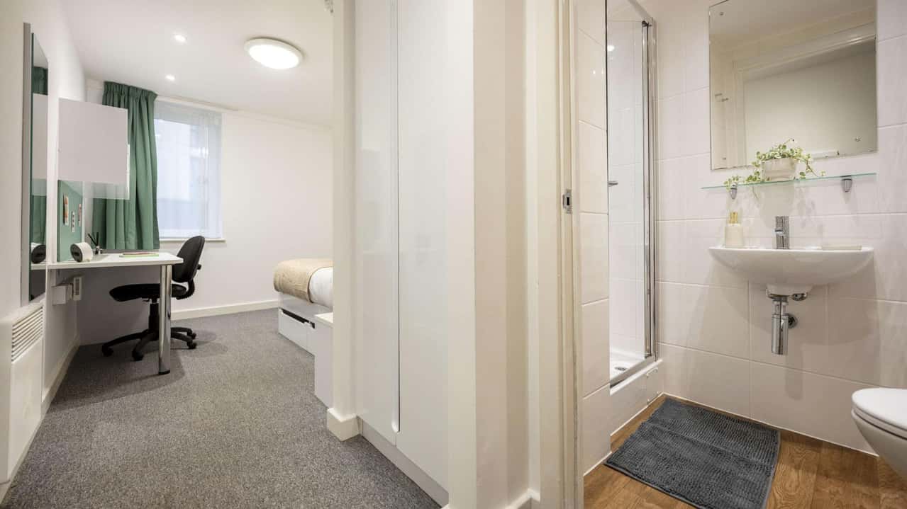 The Standard Ensuite at Glassworks provides a comfortable 13.5m² living space with a 3/4 double bed, wardrobe, bedside table, coat hooks, and under-bed storage. Featuring an electric heater and a large desk with a chair along with a noticeboard and bookshelves, this room is perfect for study sessions. The ensuite bathroom offers added privacy. Share the kitchen with essential appliances including a fridge/freezer, microwave, toaster, kettle, oven, and induction hob. The shared lounge, equipped with a sofa, coffee table, and Freeview TV, plus the dining area with a breakfast bar and stools, makes this an ideal choice for student life. Secure your Standard Ensuite room today!