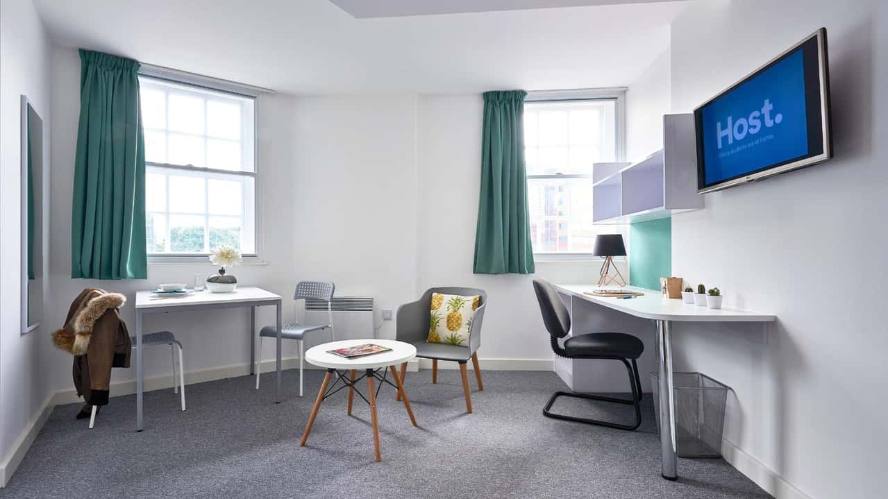 Experience premium living with the Deluxe Plus Studio at Glassworks, spanning 24.5m². This room has a 3/4 double bed, wardrobe, bedside table, coat hooks, and under-bed storage. A spacious desk and chair, bookshelves, and a noticeboard cater to your academic needs. Enjoy the privacy of your own bathroom and a private kitchen equipped with a fridge/freezer, microwave, toaster, kettle, oven, and induction hob. The dining area with a table and chairs, along with a lounge area featuring a chair and Freeview TV, makes this studio a perfect blend of comfort and functionality.