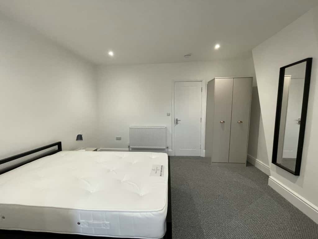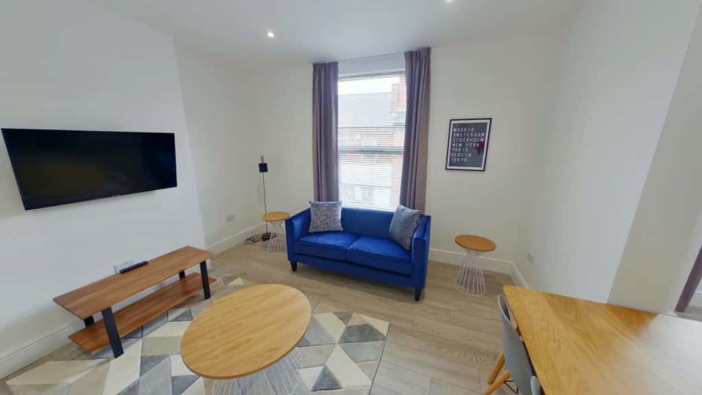 Located on Portland Street, this spacious property features two en-suite double bedrooms equipped with desks, comfortable chairs, and ample storage. The inviting living room boasts spacious sofas and a large flat-screen TV, ideal for socialising or relaxation, complemented by a dining area for communal meals.